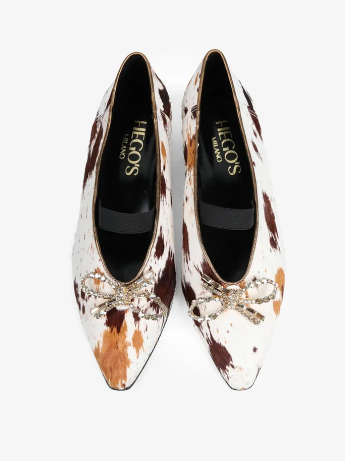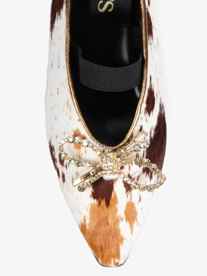 Baleriny z noskiem w szpic i gumką na podbiciu, wykonane z naturalnej skóry z włosiem. Wykończone ozdobną, biżuteryjną kokardą.