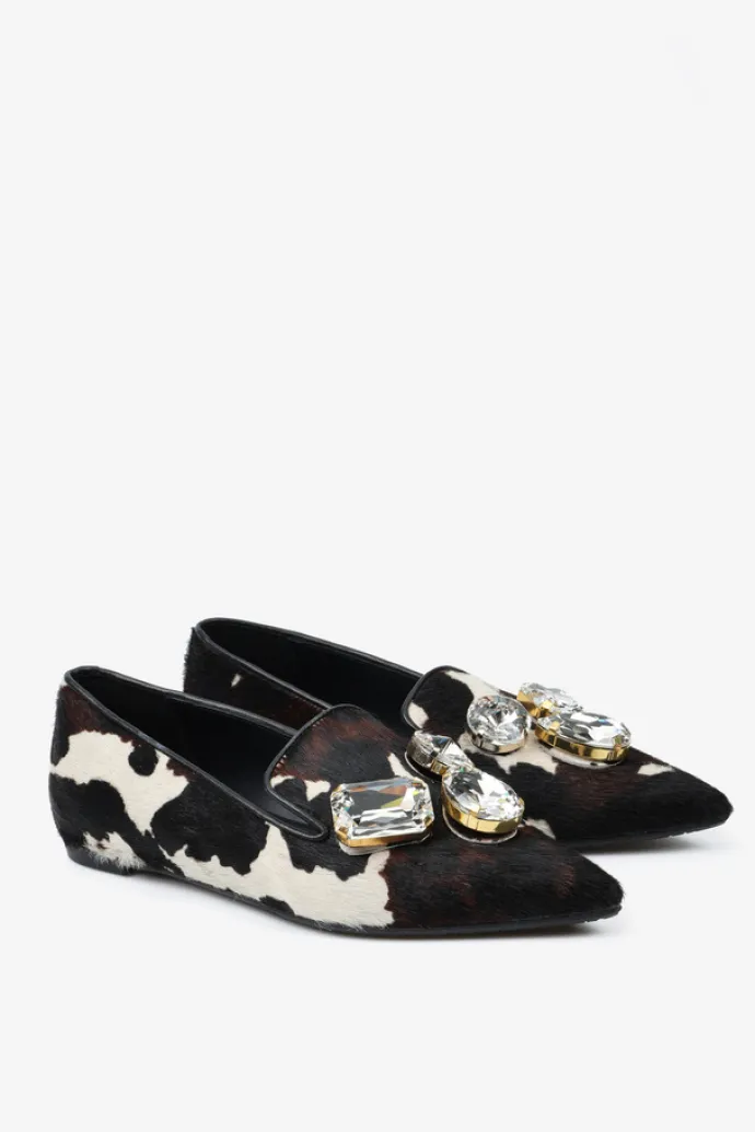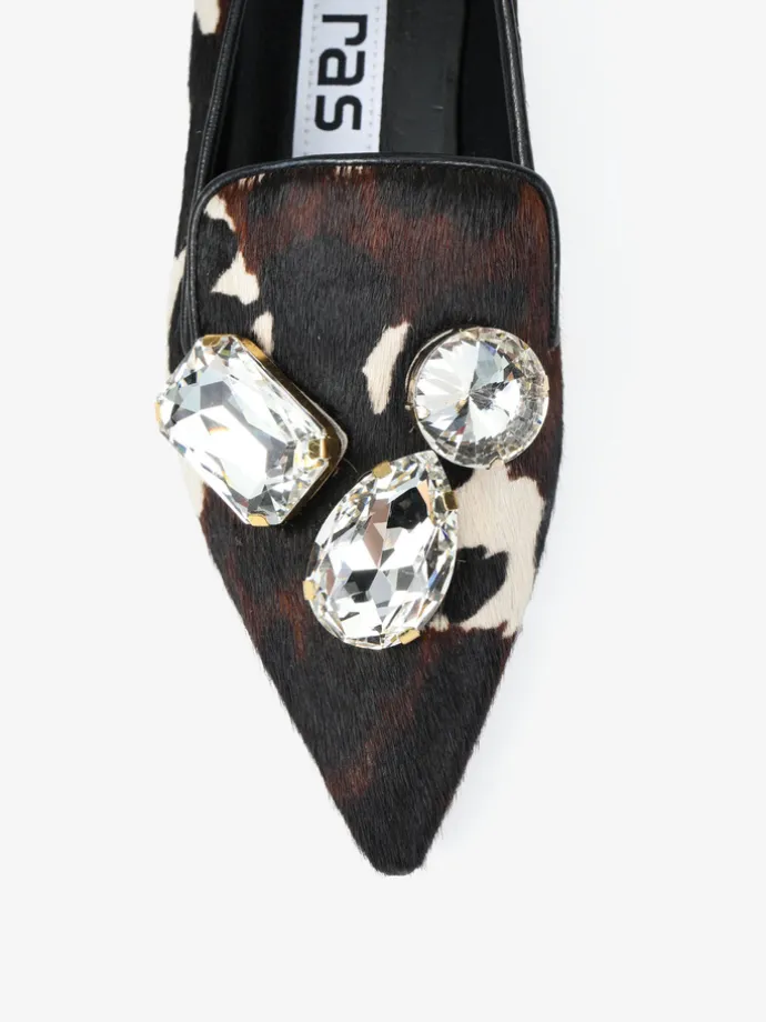 Baleriny RAS wykonane z naturalnej skóry z włosiem w zwierzęcy wzór. Nosek w szpic z ozdobnymi kamieniami.