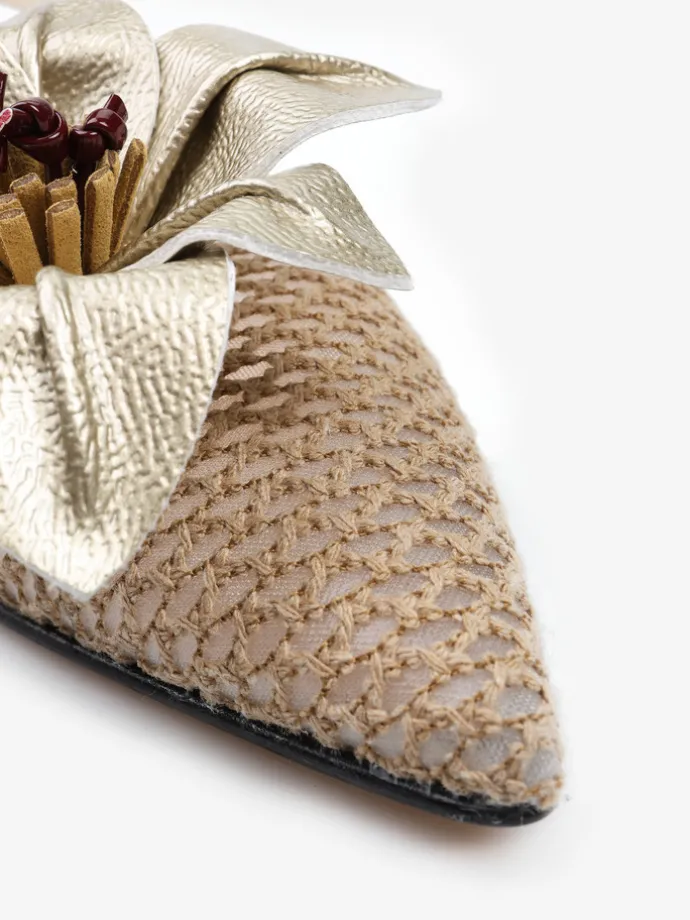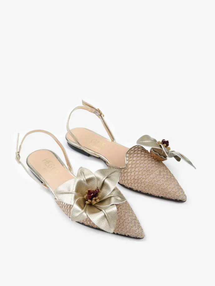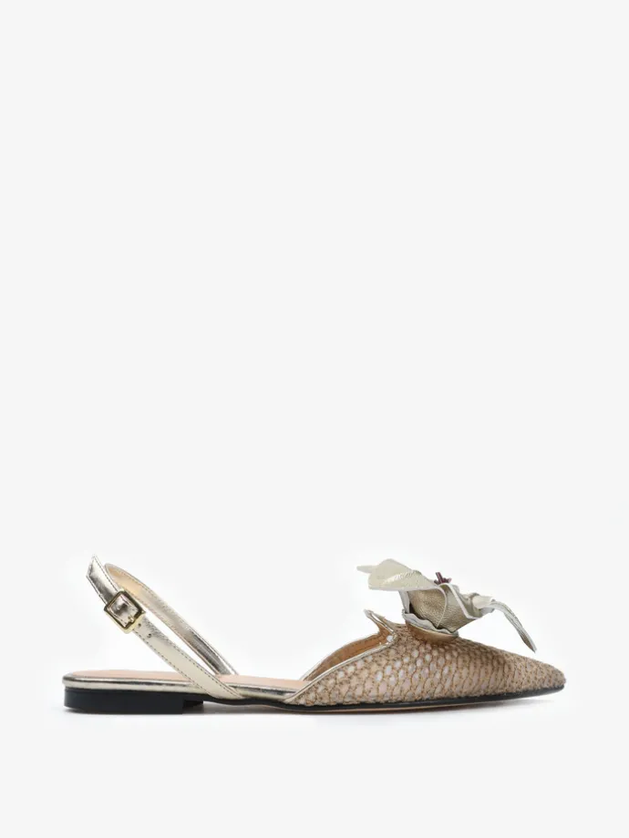 Baleriny z noskiem w szpic z przewiewnej siatczki i ozdobnym kwiatem. Odkryta pięta z regulowanym paskiem.