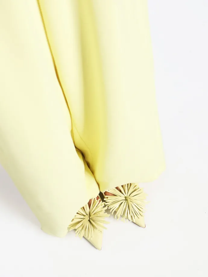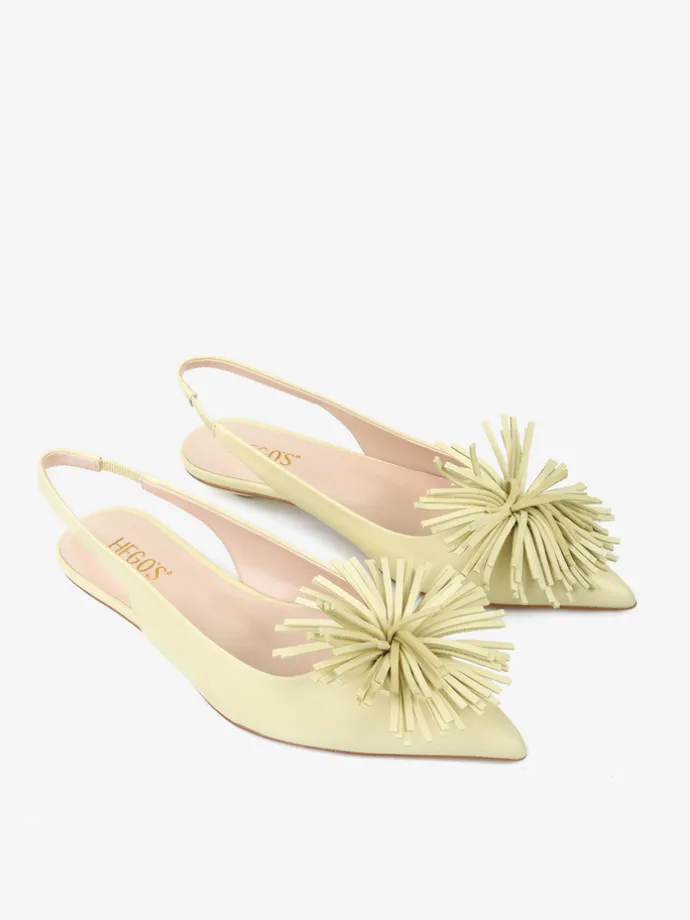 Baleriny z noskiem w szpic i ozdobnym, skórzanym pomponem. Odkryta pięta z paskiem dopasowującym się do stopy.