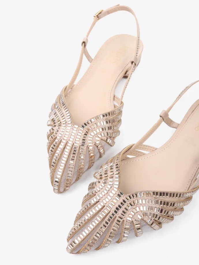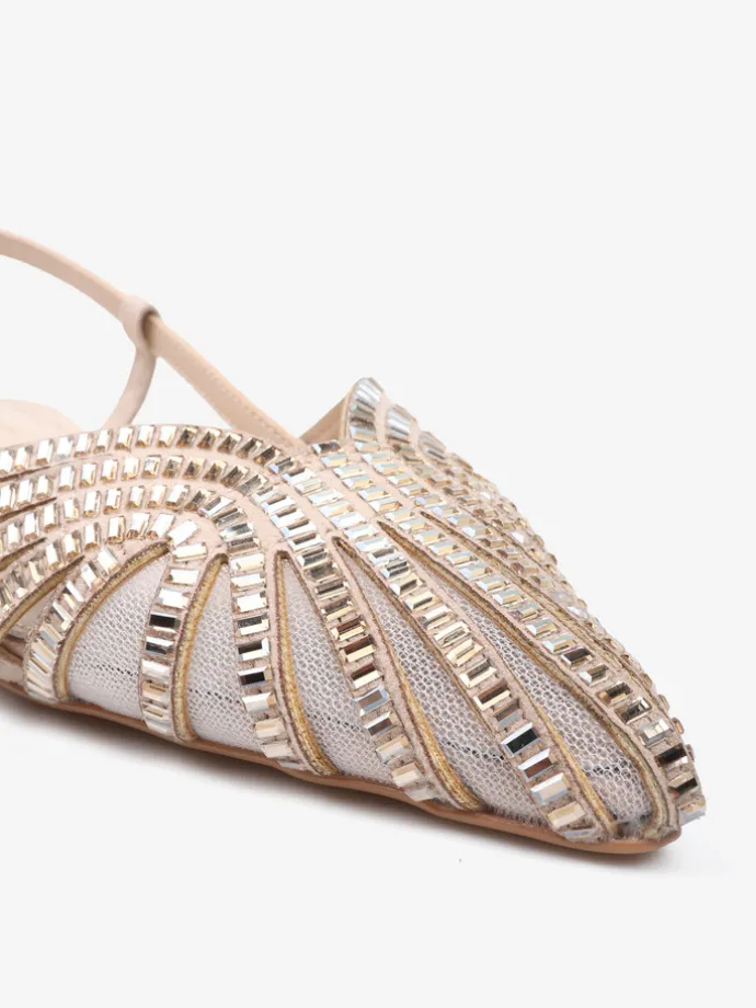 Baleriny z odkrytą piętą z regulowanym paskiem. Ażurowy nosek w szpic z siateczką i ozdobnymi, połyskującymi kamyczkami.