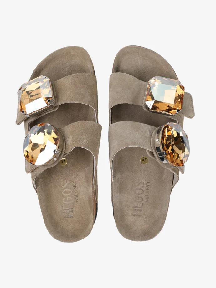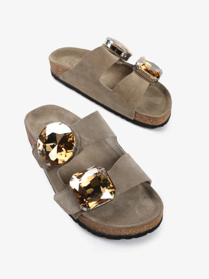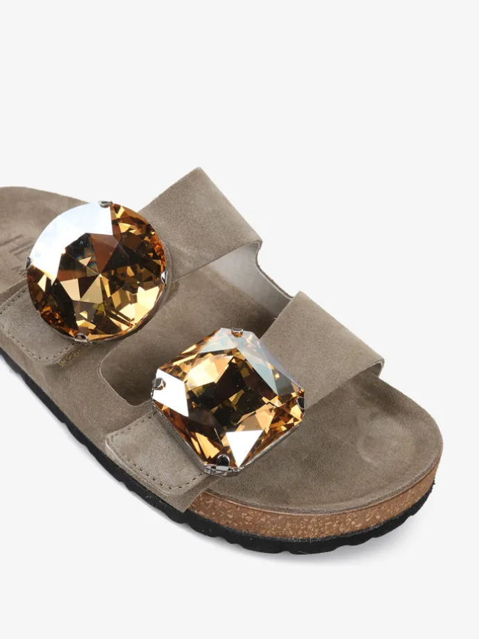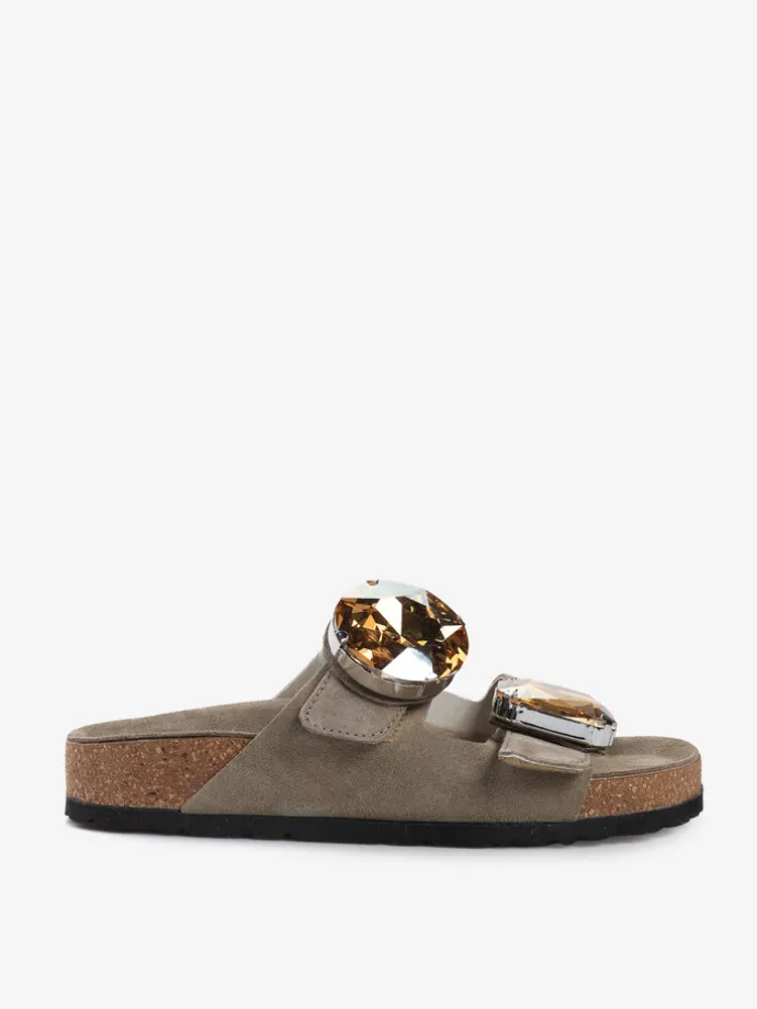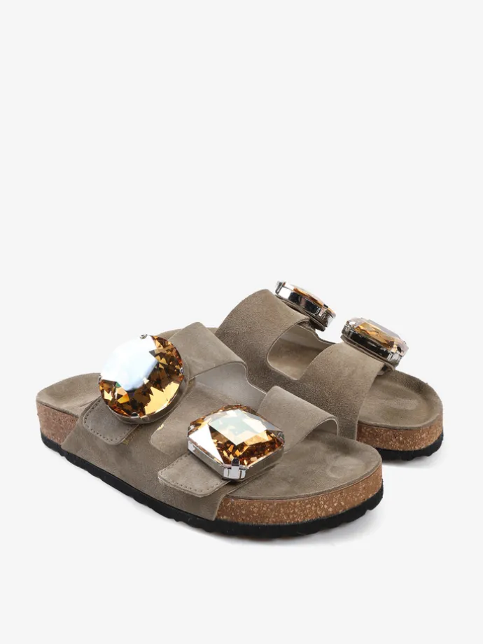 Zamszowe klapki z ozdobnymi kamieniami i paskami zapinanymi na rzep.