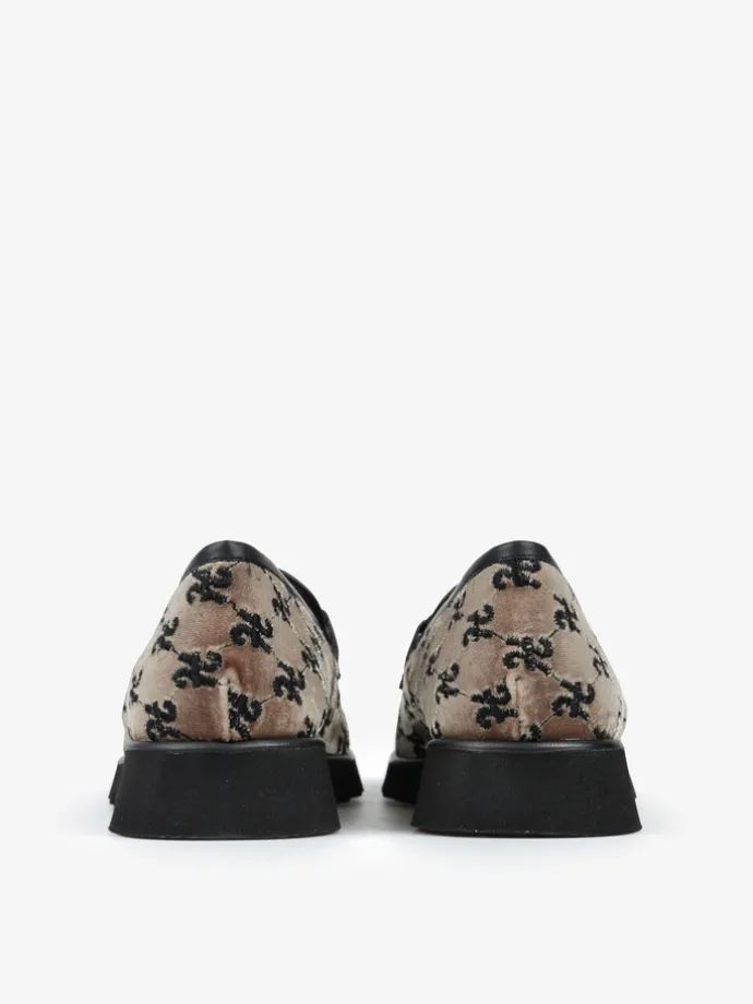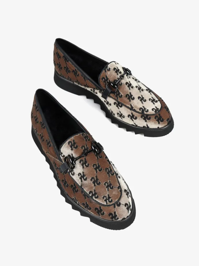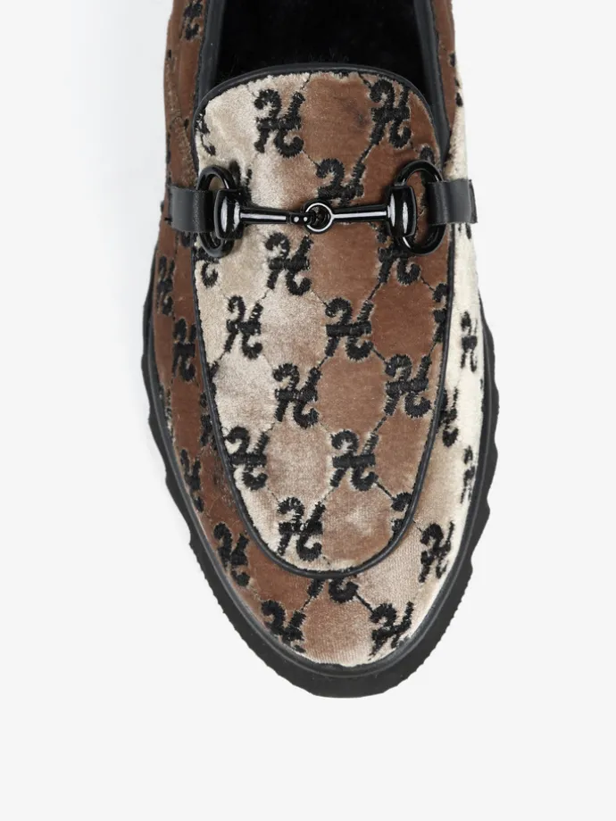 Welurowe mokasyny na efektownej podeszwie z wnętrzem wyłożonym miękkim, sztucznym futrem. Ozdobne wędzidło i haft z monogramem.