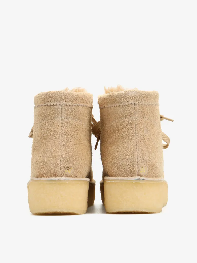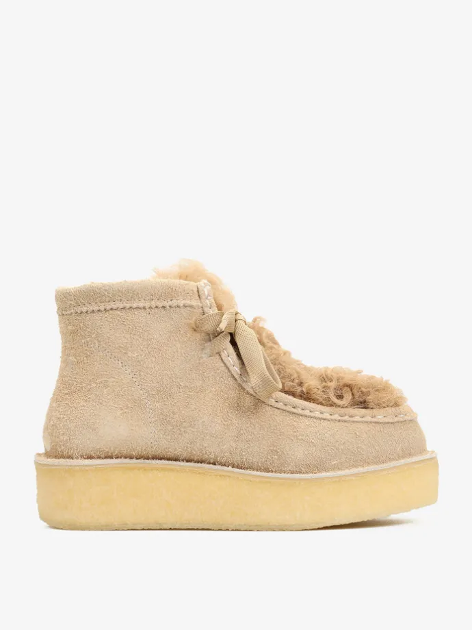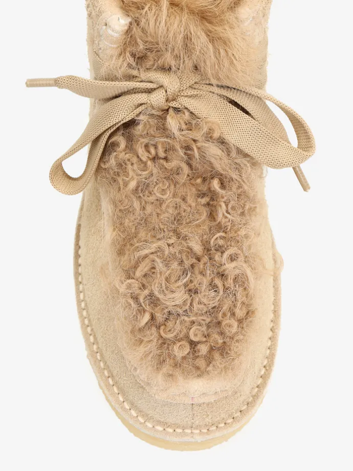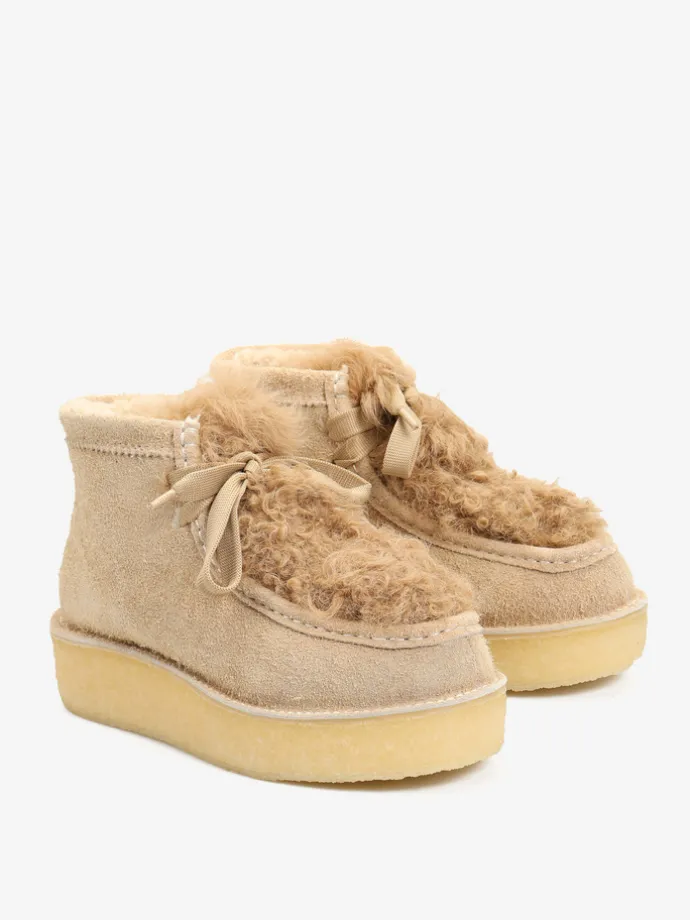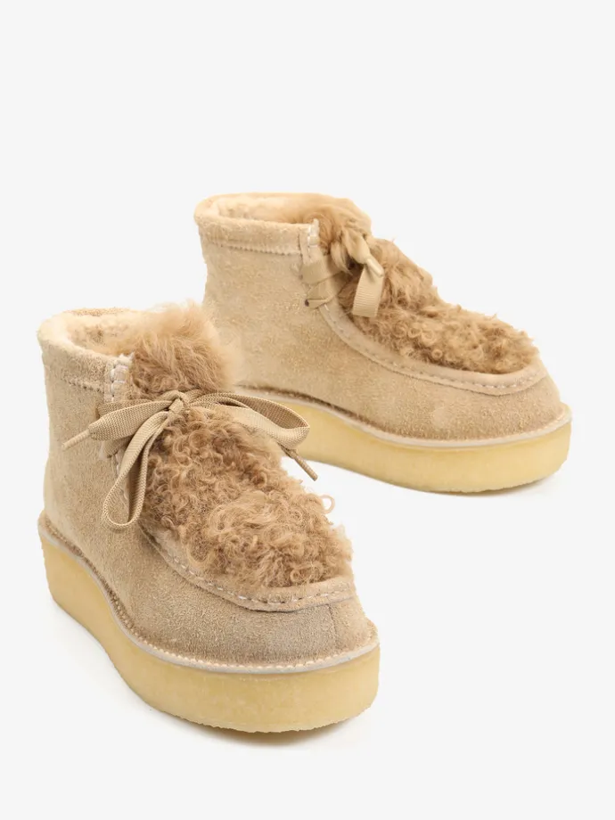 Zamszowe śniegowce na platofmie, wyłożone w środku tkaniną imitującą futro baranka. Wiązanie na sznurowadła.