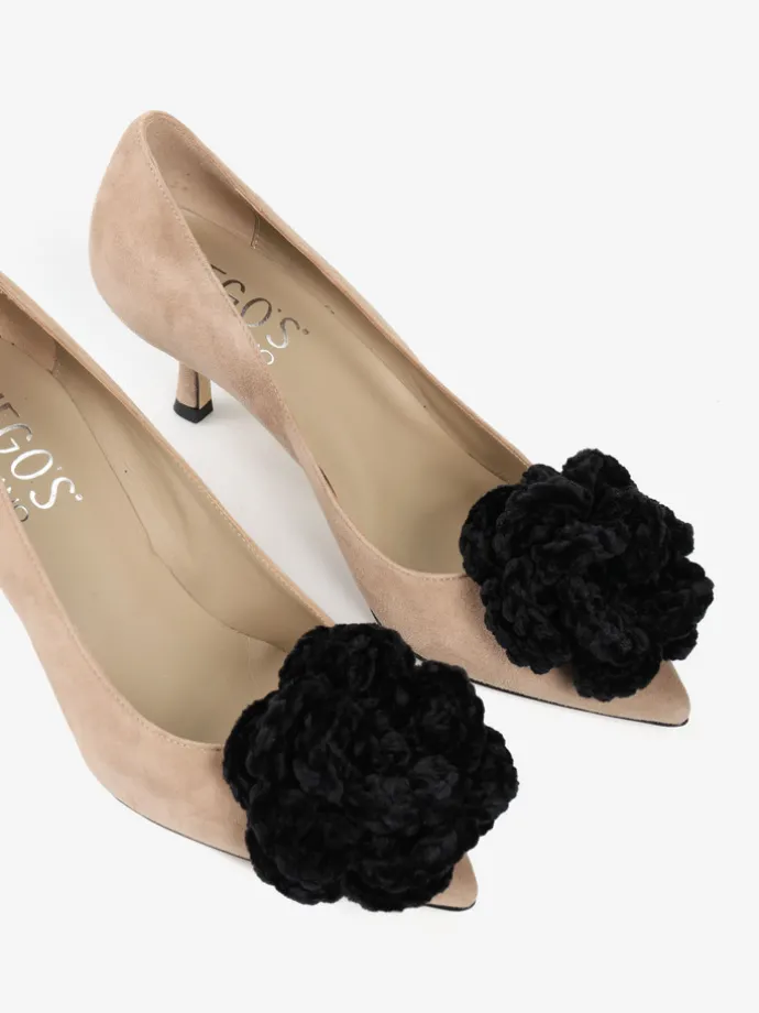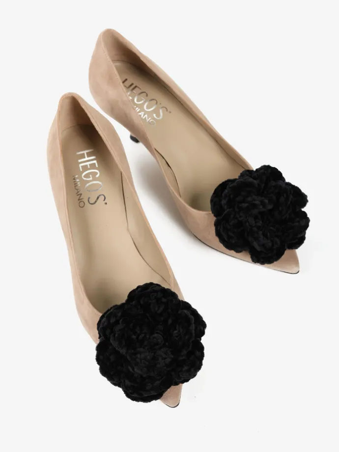 Zamszowe szpilki z noskiem w szpic ozdobione szydełkowym, czarnym kwiatem.