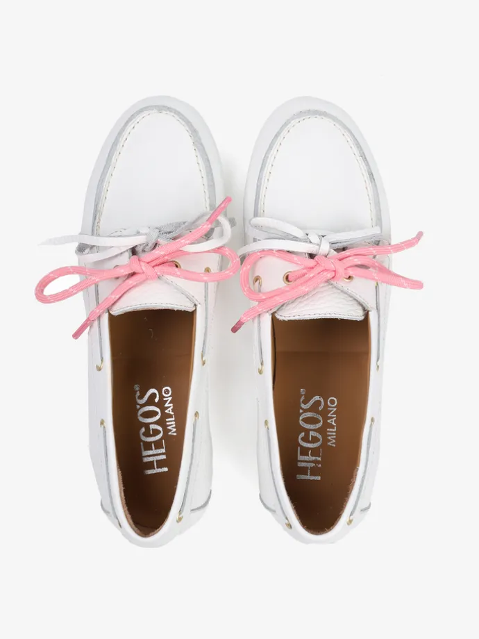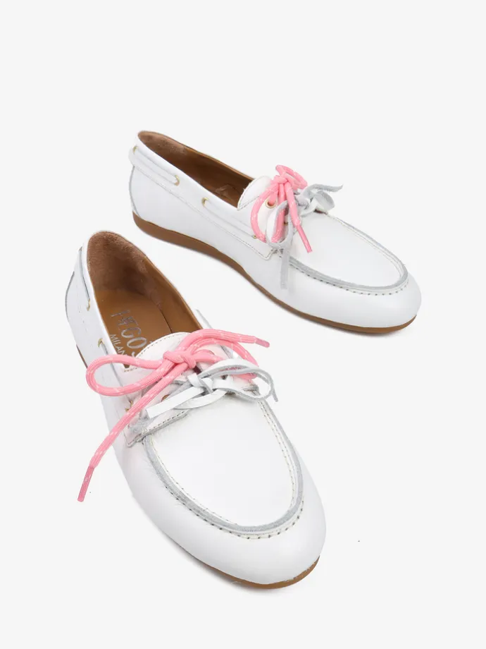 Mokasyny wykonane z białej skóry z wiązaniem pozwalającym na idealne dopasowanie. Dodatkowe sznurowadła w kontrastującym, różowym kolorze.