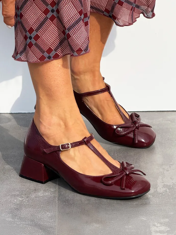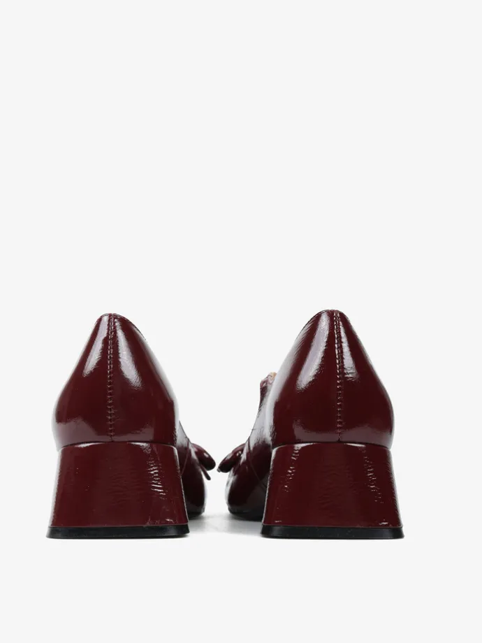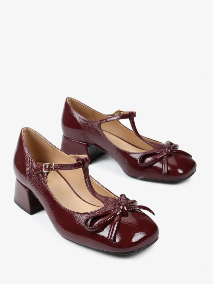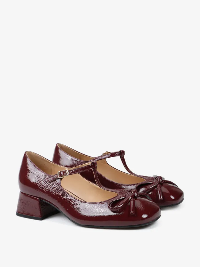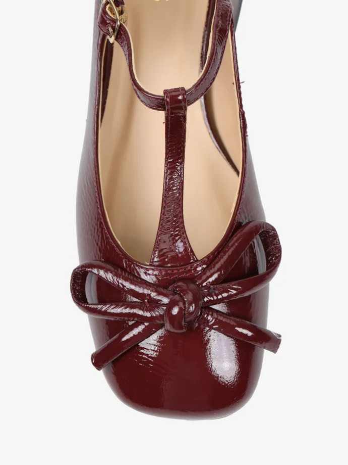 Lakierowane czółenka Mary Jane z paskiem na podbiciu i regulowanym zapięciem. Kwadratowy nosek z ozdobną kokardką.