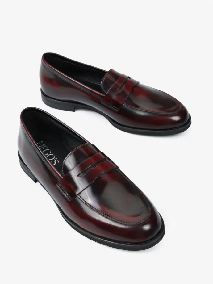 Klasyczne mokasyny z patką, wykonane z wysokopolerowanej skóry z efektem sprania.
