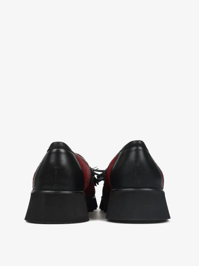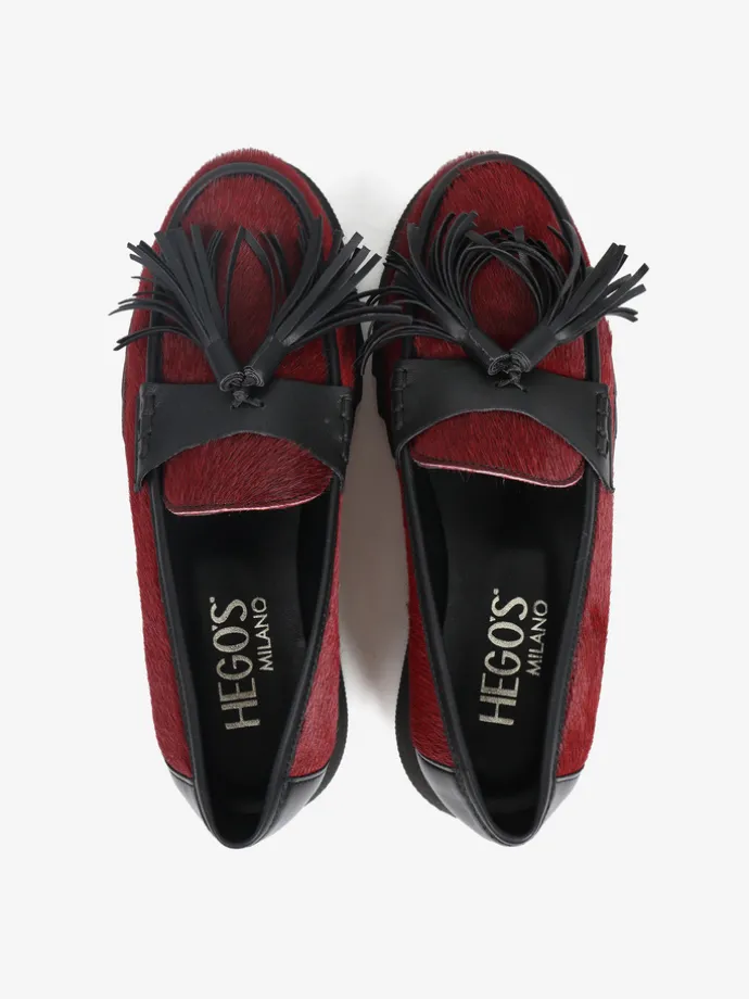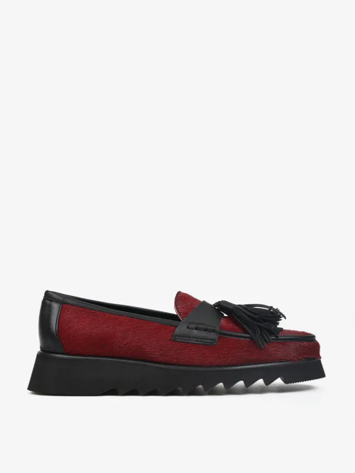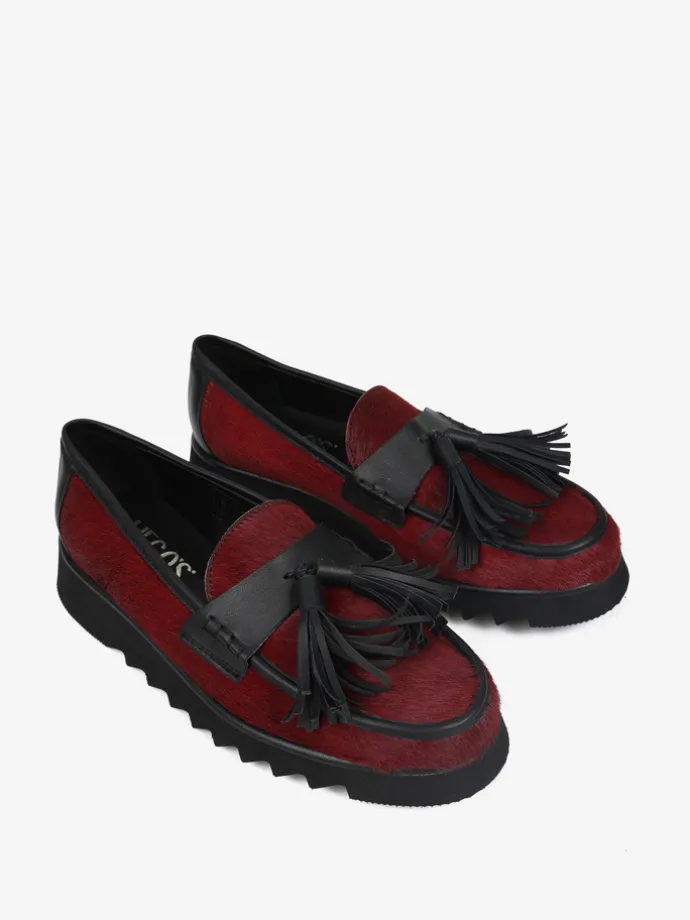 Bordowe mokasyny na efektownej podeszwie wykonane z naturalnej skóry z włosiem. Ozdobna patka z frędzlami.