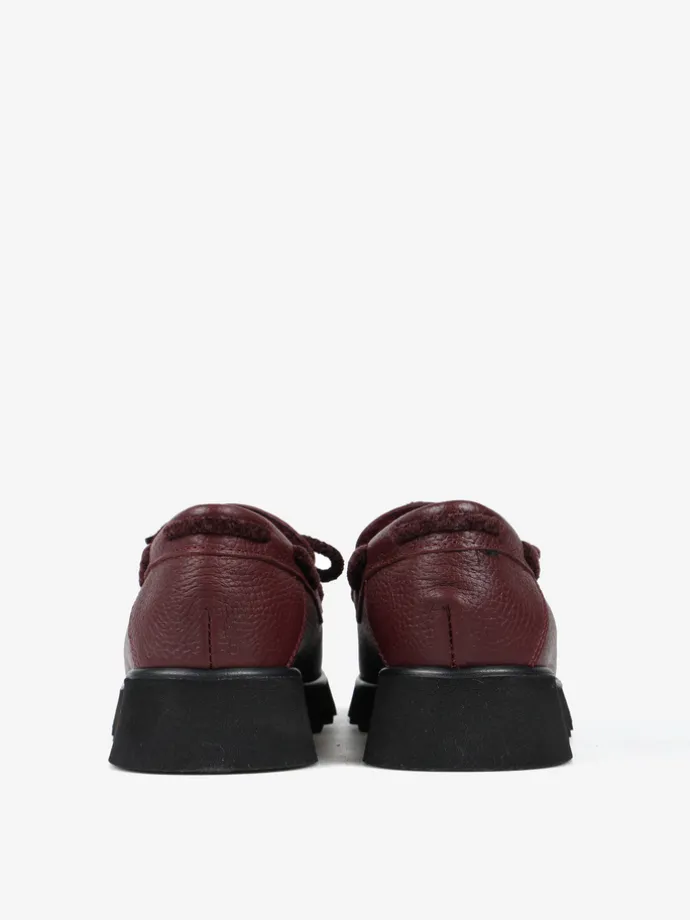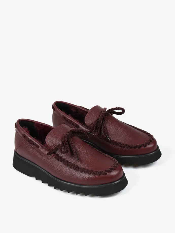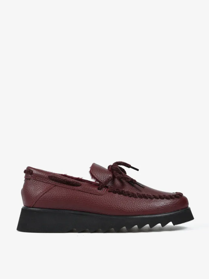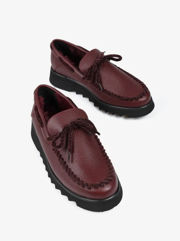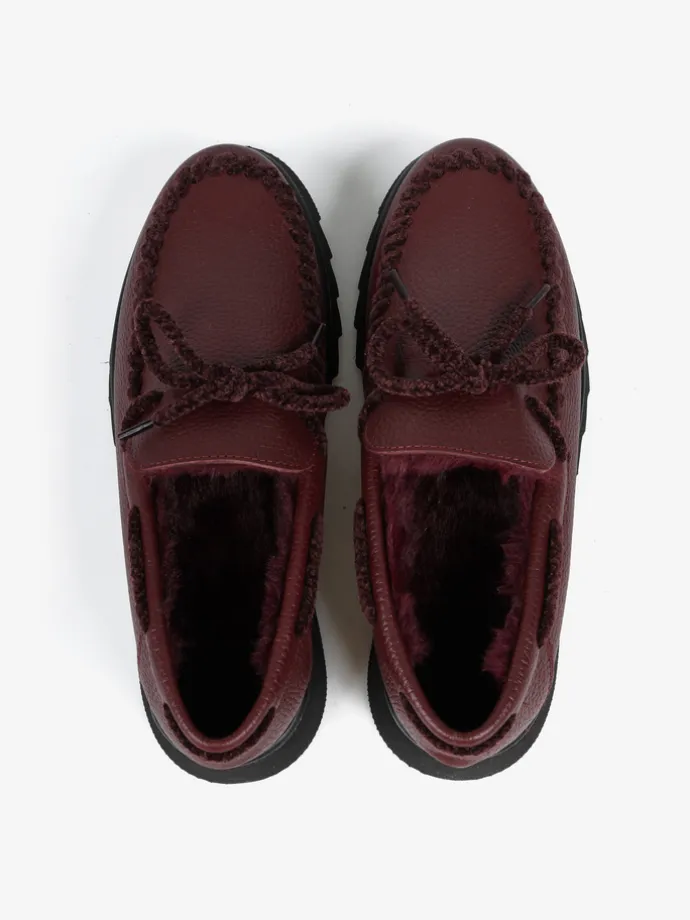 Skórzane mokasyny na efektownej podeszwie z wnętrzem wyłożonym miękkim, sztucznym futrem. Wiązanie z bordowego sznurka pozwala na idealne dopasowanie.