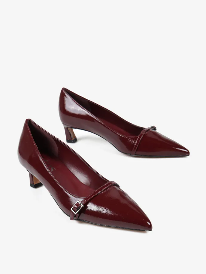 Eleganckie szpilki wykonane ze skóry lakierowanej. Nosek w szpic z ozdobnym paseczkiem.