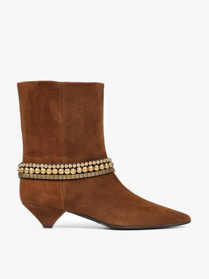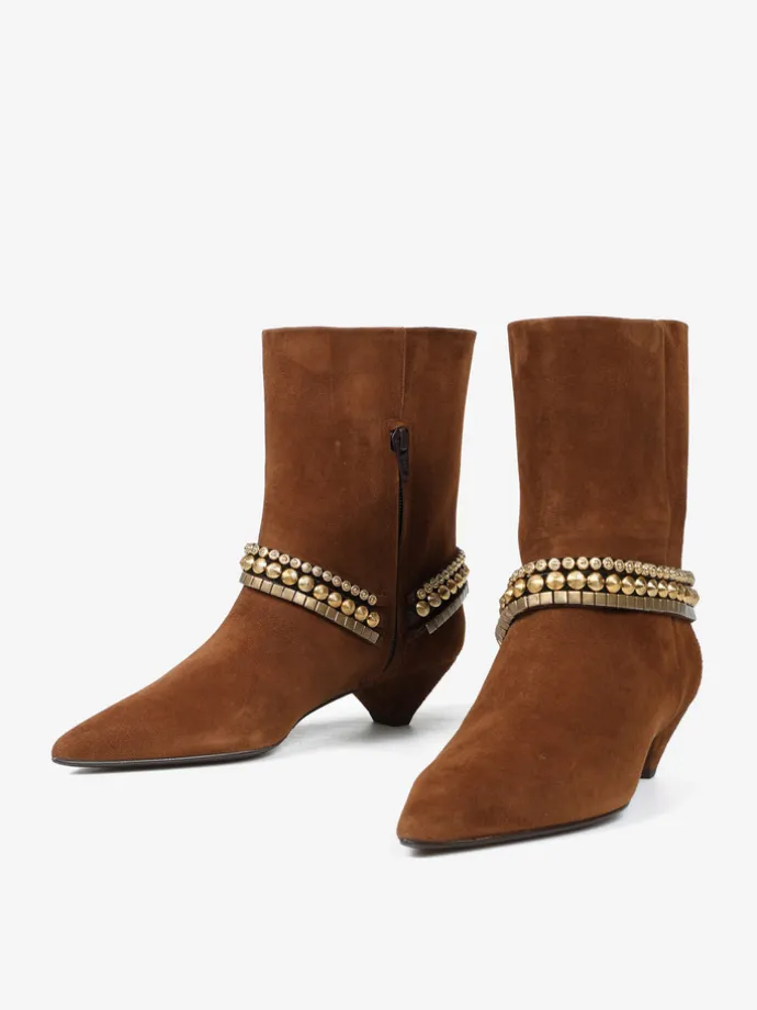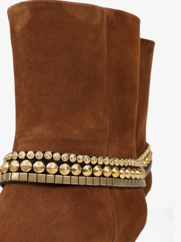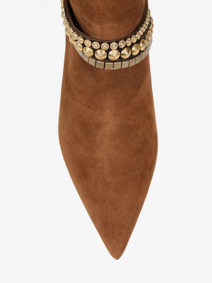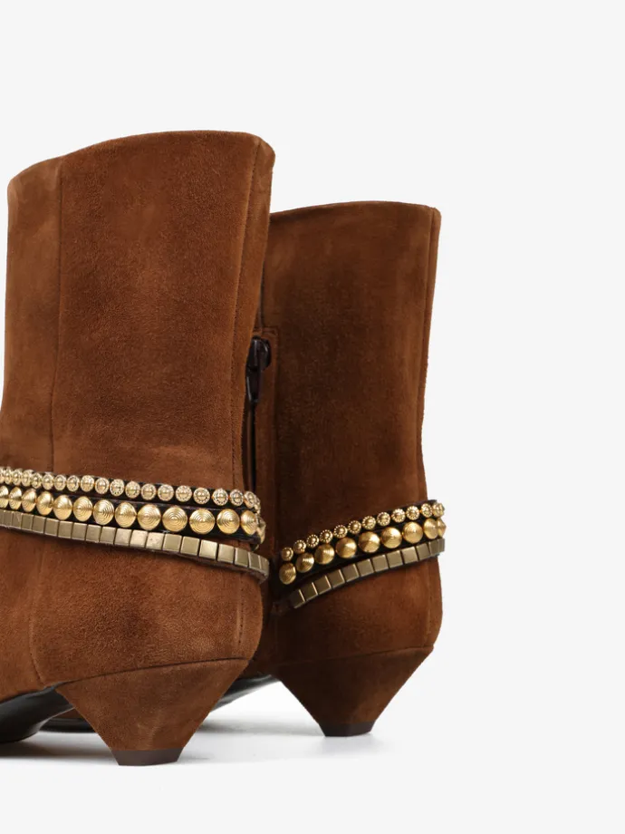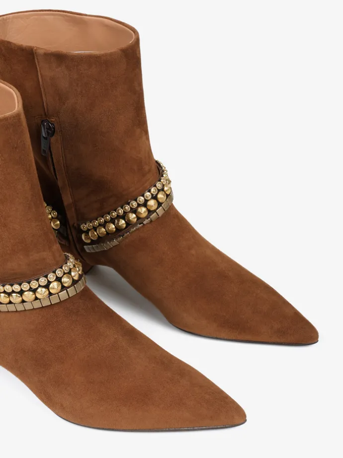 Zamszowe botki na niskiej szpilce, z noskiem w szpic. Zapięcie na suwak i ozdobne bransoletki na kostce.