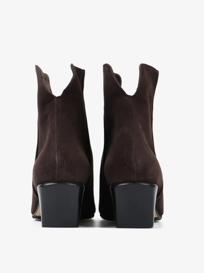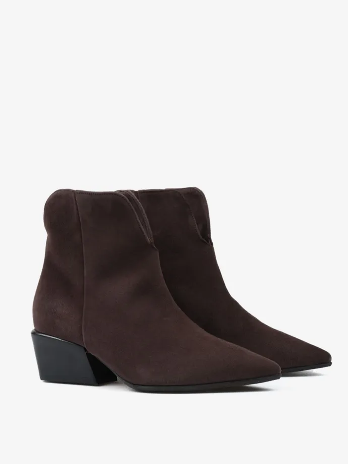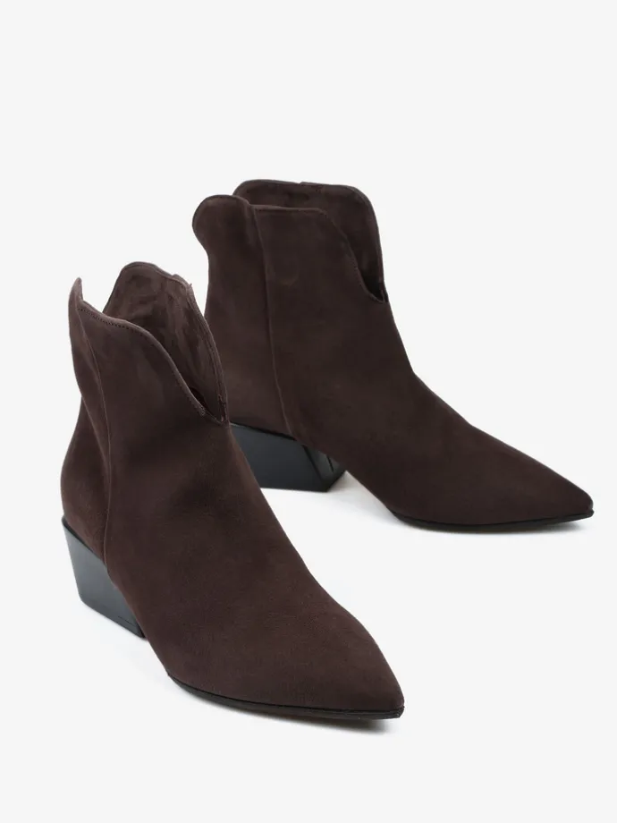 Limitowany model w klasycznym, brązowym kolorze, w całości wykonany jest z włoskiego zamszu. Eleganckie i modne wycięcie cholewki odpowiada za komfort i wygodę w chodzeniu. Mocno zarysowany nosek w szpic oraz charakterystyczny dla kowbojek ścięty obcas sprawiają, że klasyczny model nabiera nowoczesnego designu.