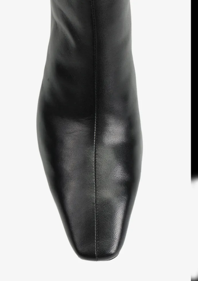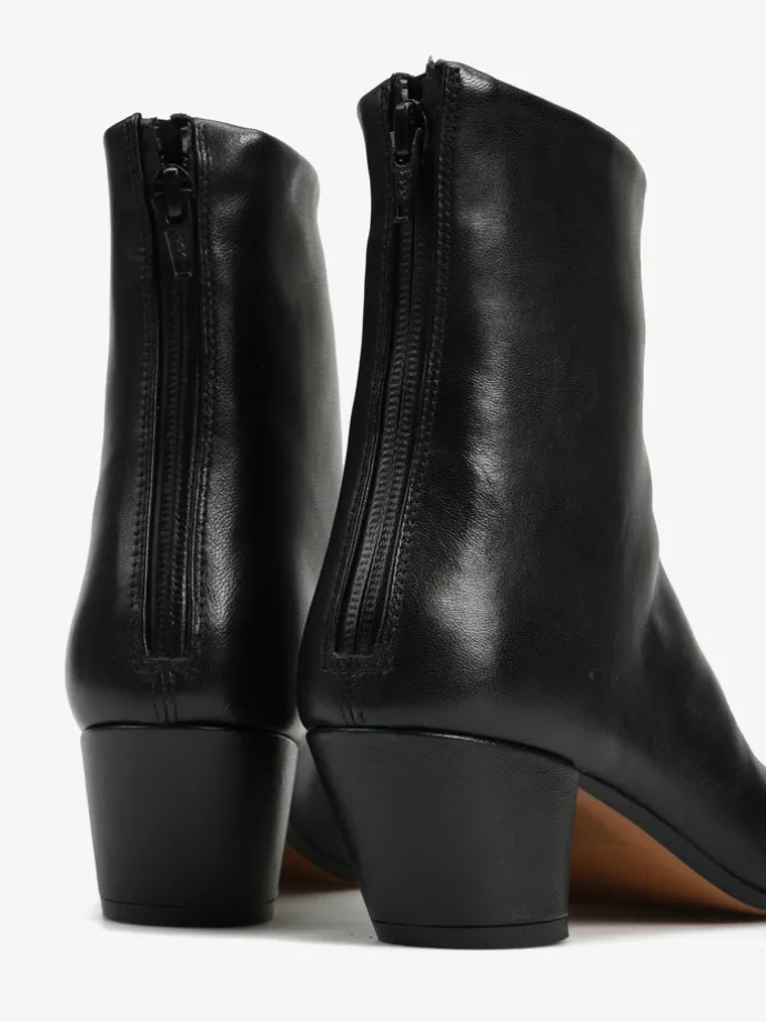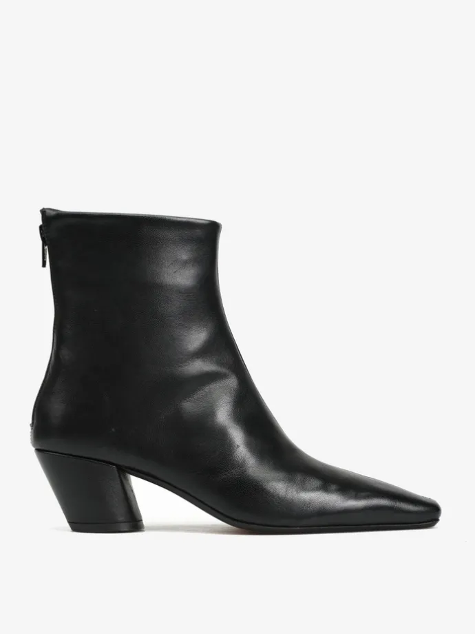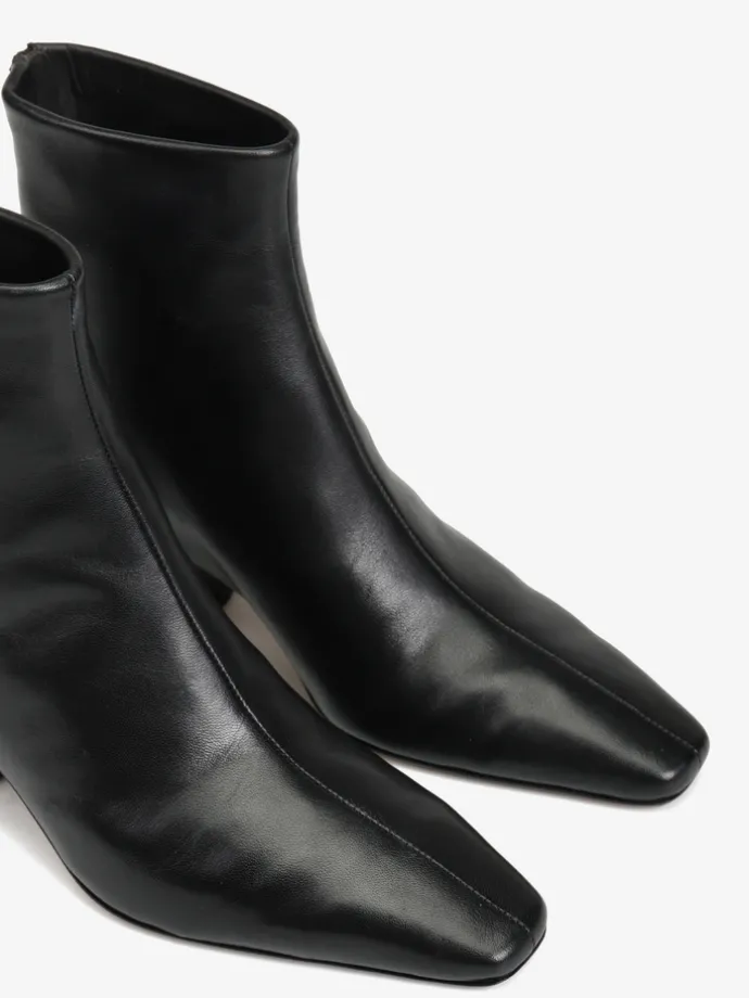 Skórzane botki ze ściętym obcasem i zapięciem na suwak. Wydłużone, kwadratowe noski.