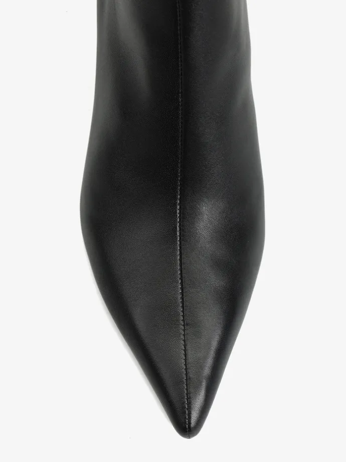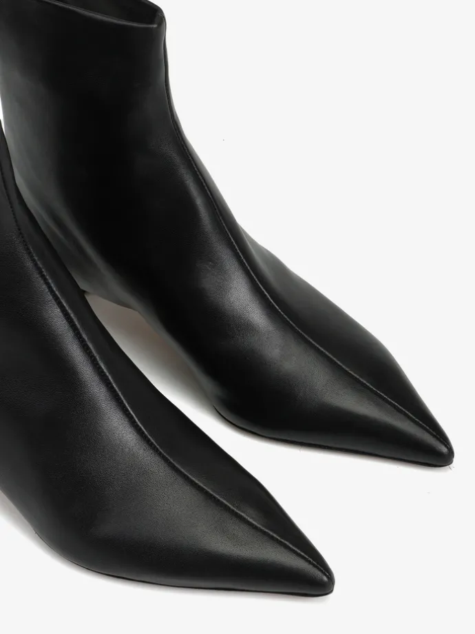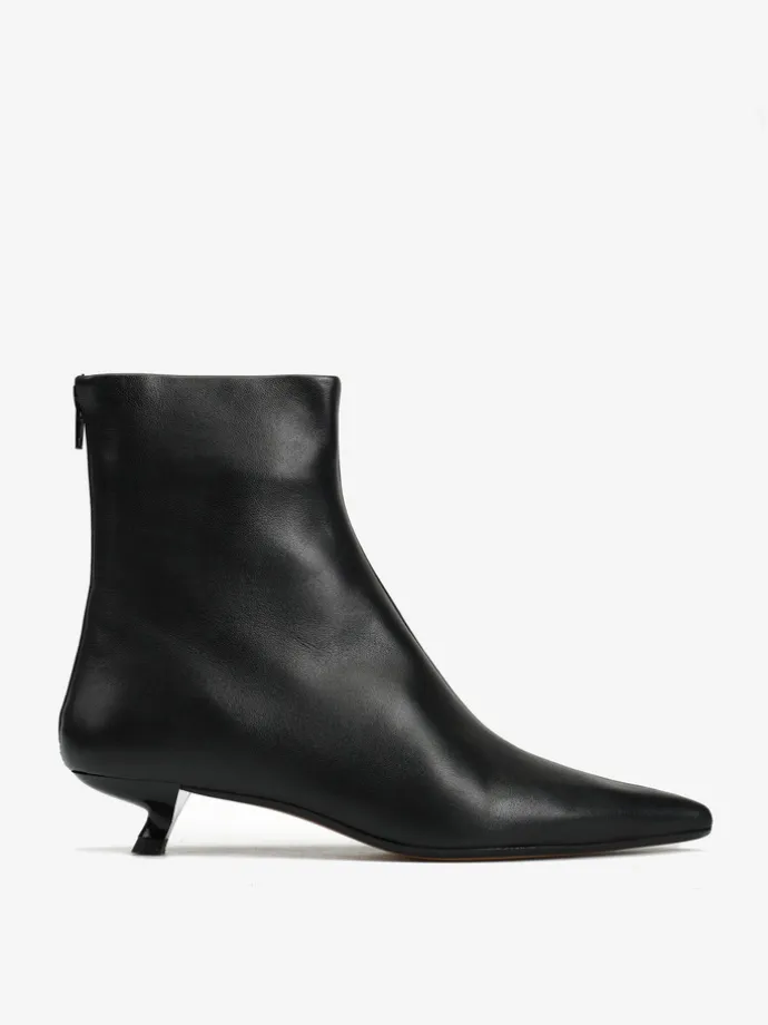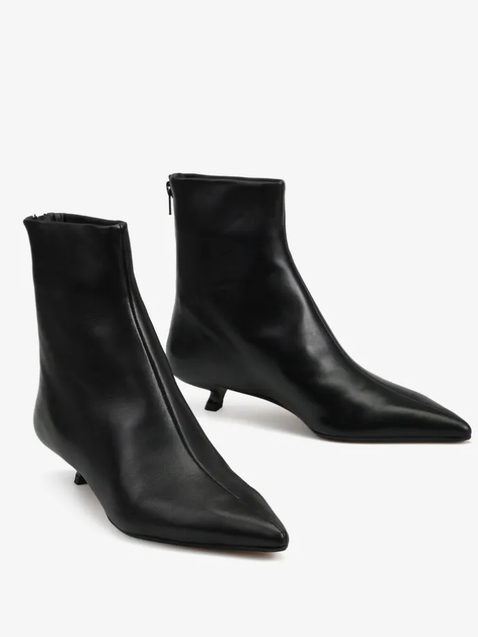Skórzane botki na niskiej, profilowanej szpilce. Noski w szpic i zapięcie na suwak.