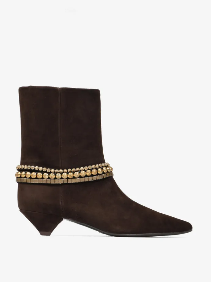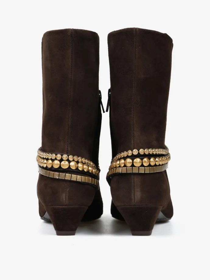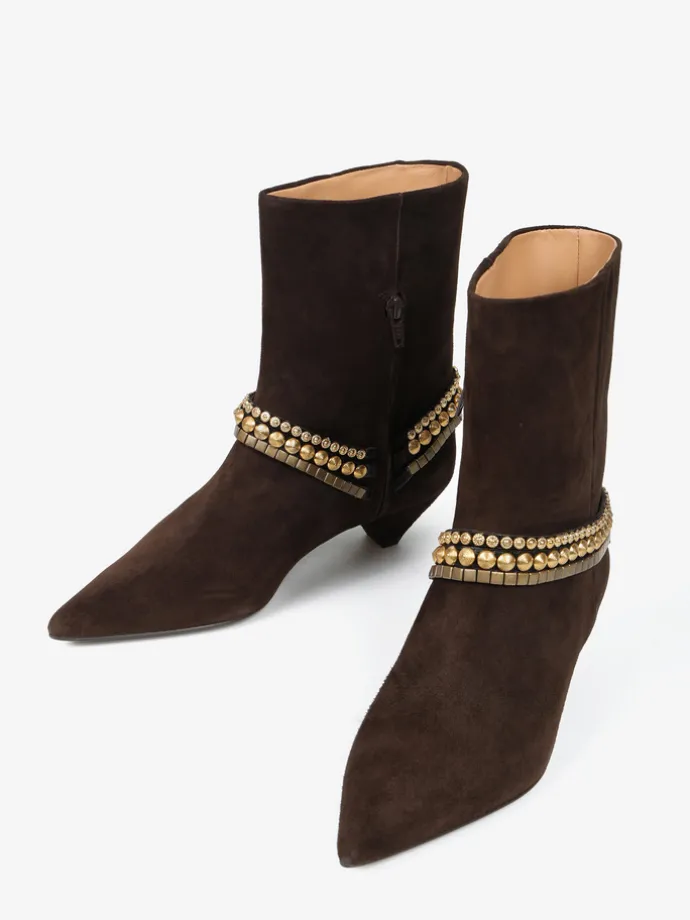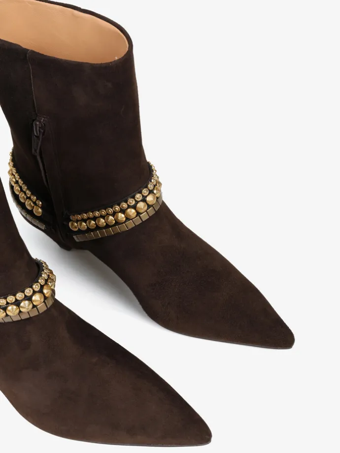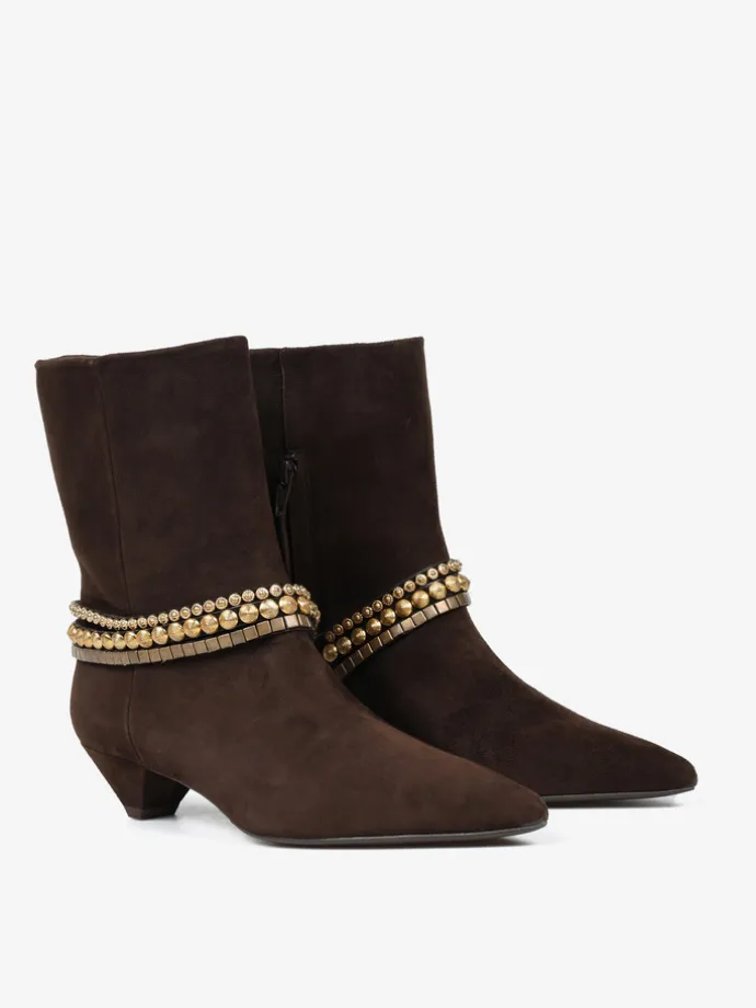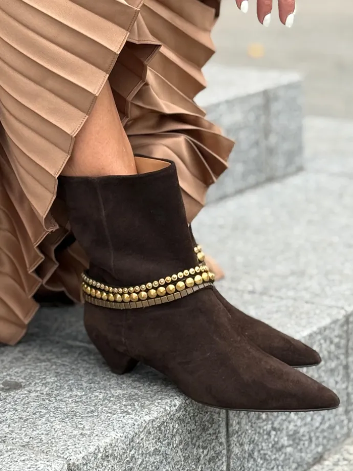 Zamszowe botki na niskiej szpilce, z noskiem w szpic. Zapięcie na suwak i ozdobne bransoletki na kostce.