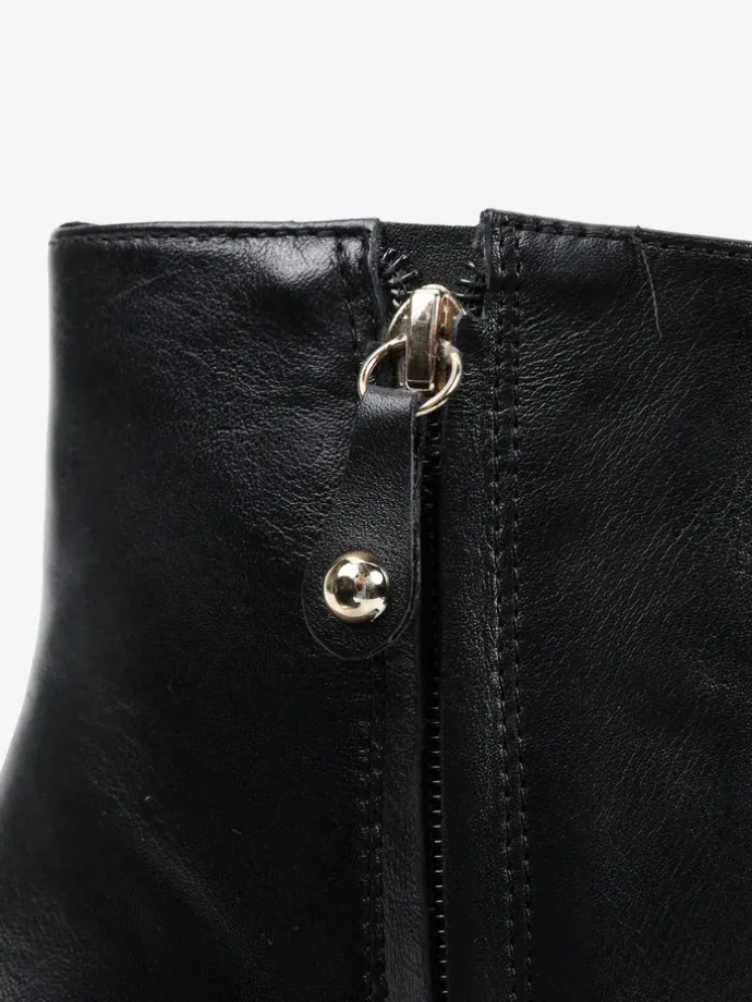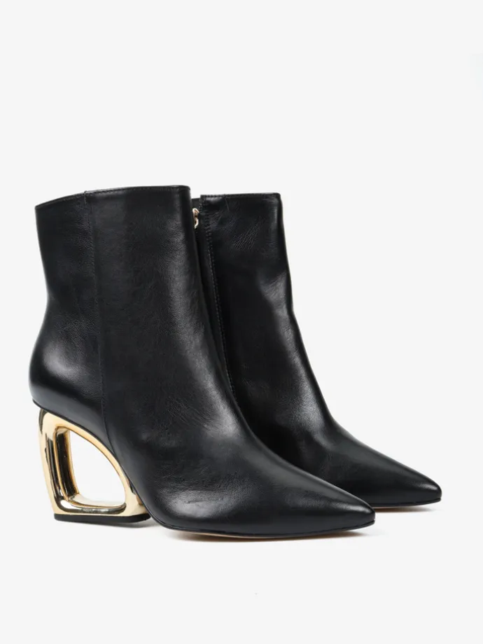 Eleganckie botki z zapięciem na zamek, wykonane z miękkiej i delikatnej skóry. Geometryczny, złoty obcas i nosek w szpic.