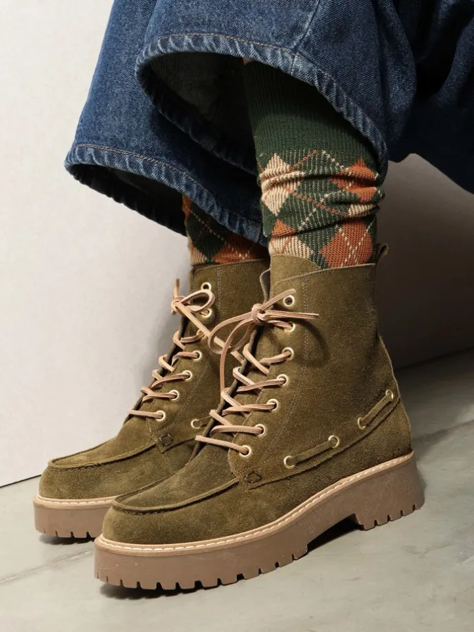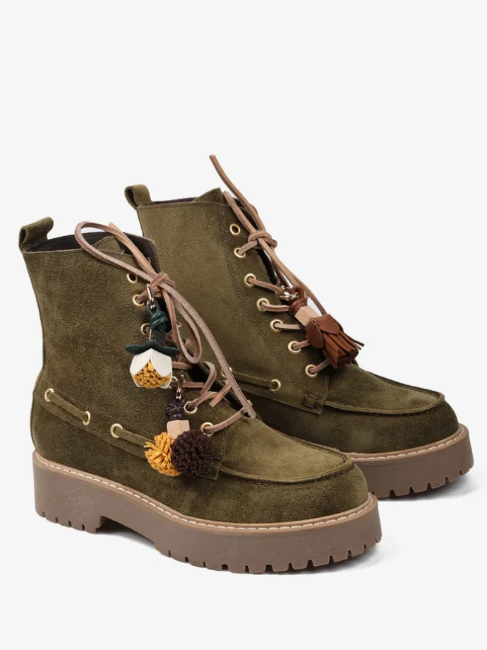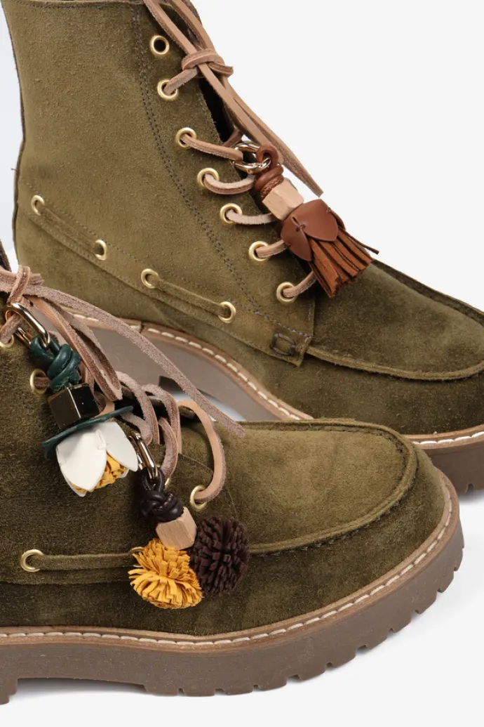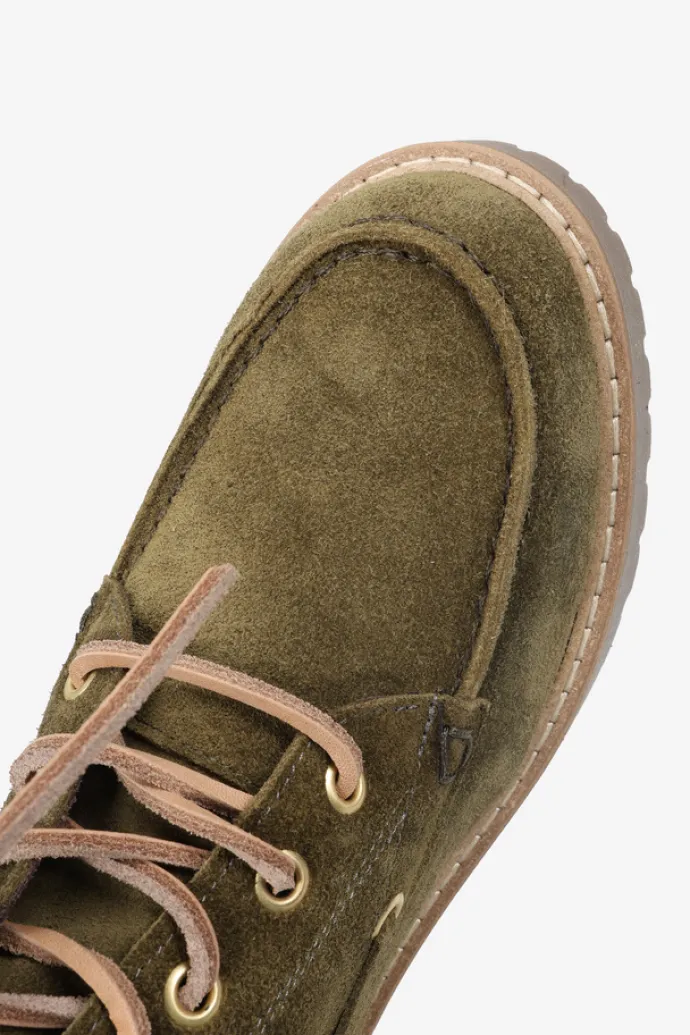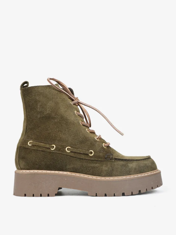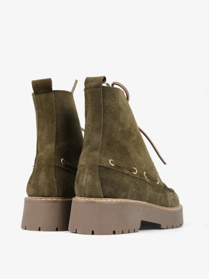 Botki na platformie w stylu boat shoe. Wykonane z zielonego zamszu i sznurowane na rzemyk.
