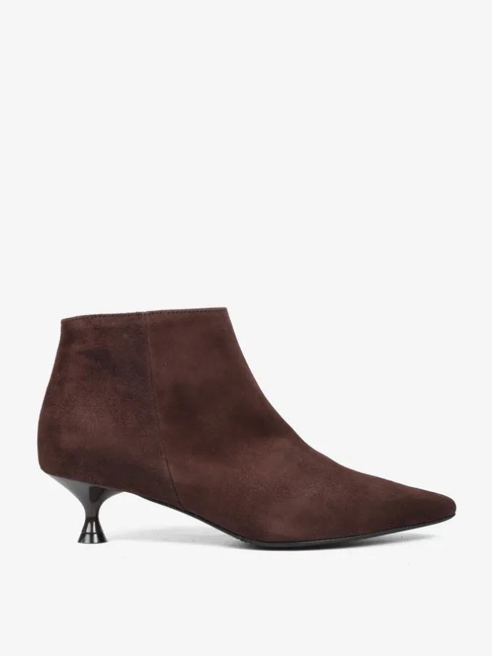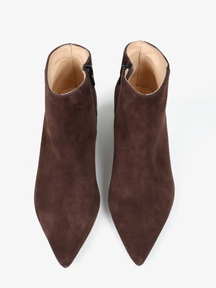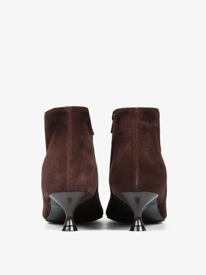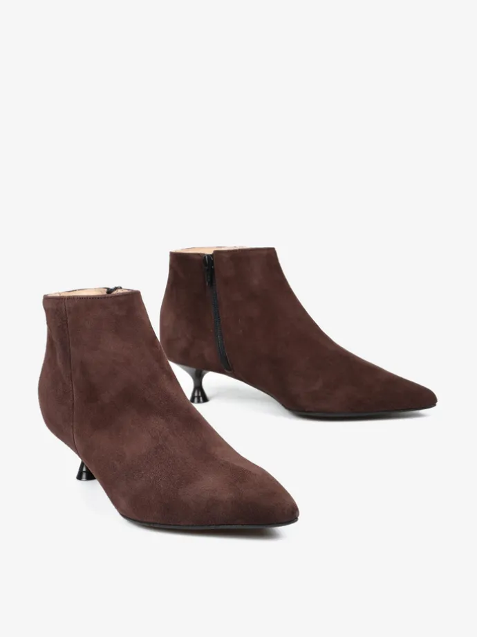 Proste, zamszowe botki na niskiej szpilce. Noski w szpic i zapięcie na suwak.
