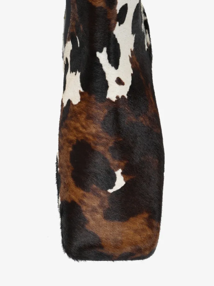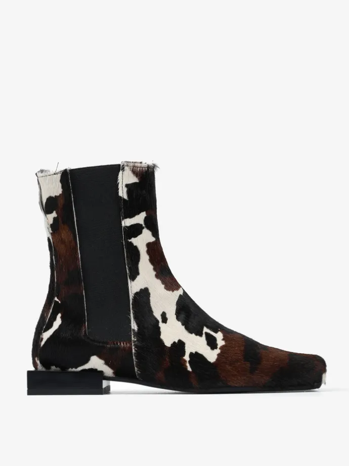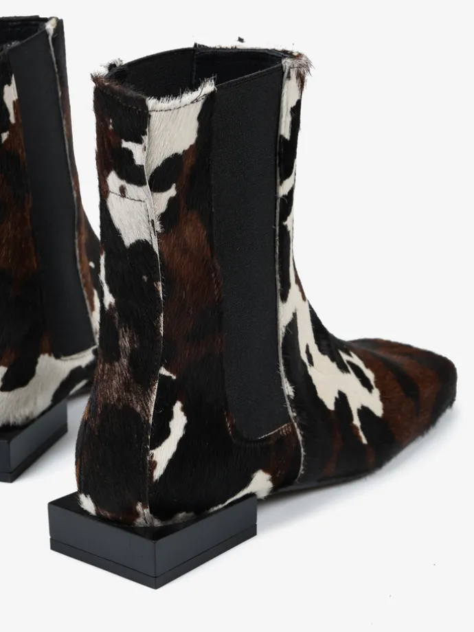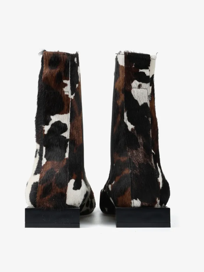 Wsuwane botki RAS na niskim klocku, wykonane ze skóry z włosiem w zwierzęcy wzór. Kwadratowe noski.