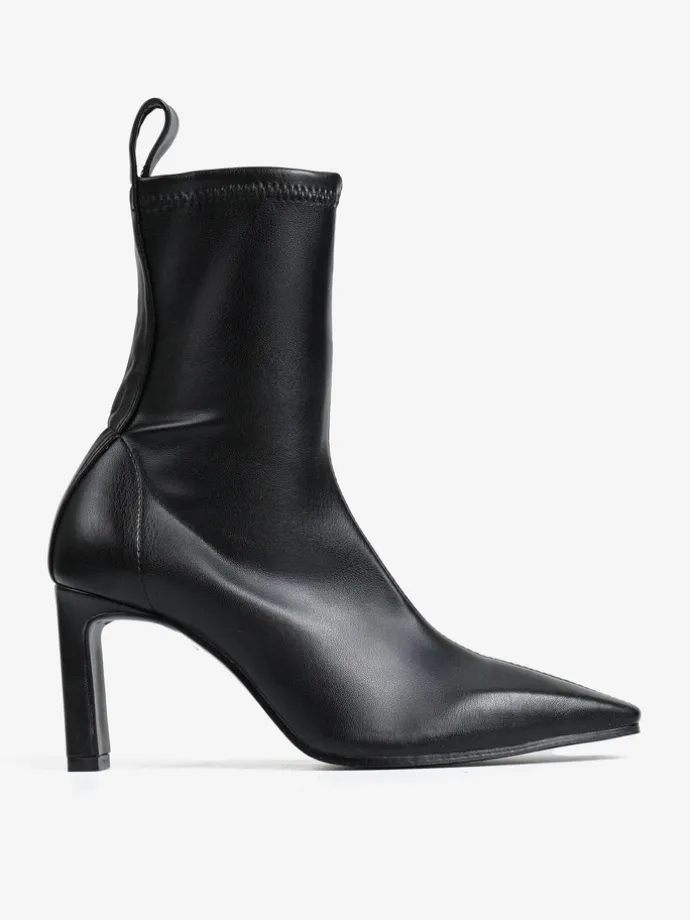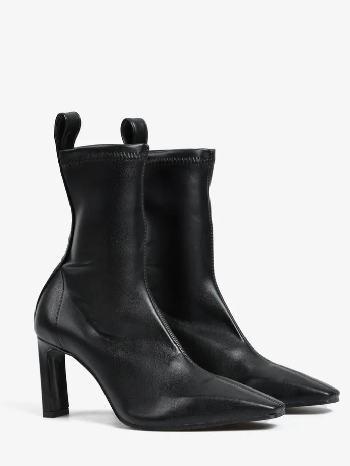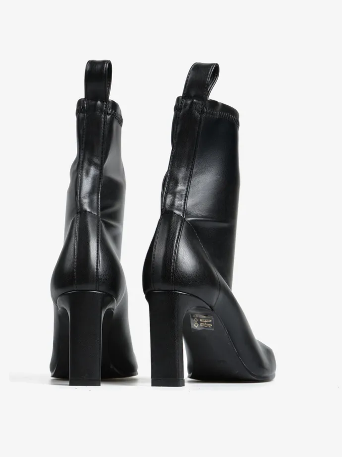 Czarne botki na szpilce wykonane z elastycznej, dopasowującej się do stopy skóry ekologicznej. Noski w szpic.