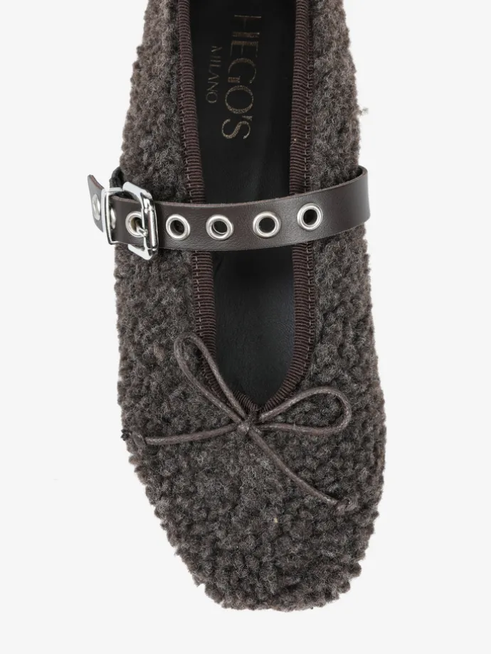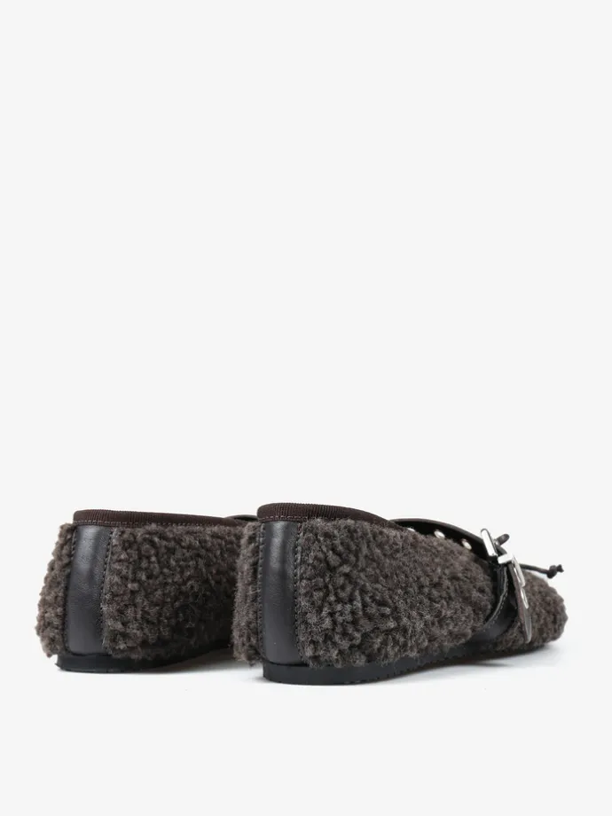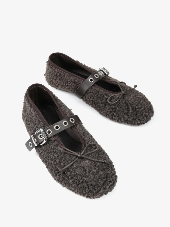 Baleriny z tkaniny imitującej futro baranka. Wiązana kokardka i regulowany pasek umożliwiają idealne dopasowanie.