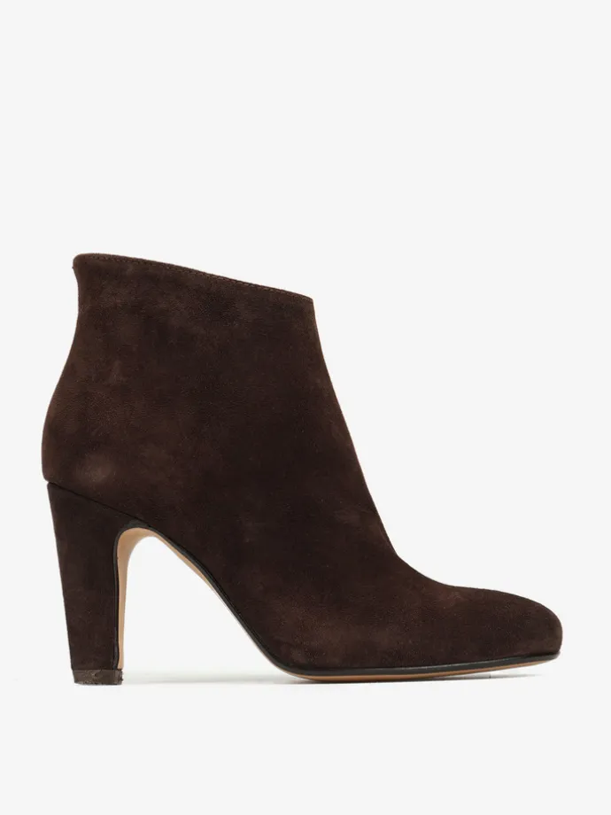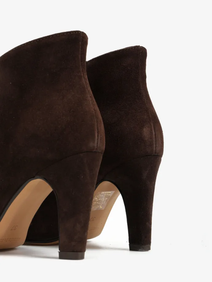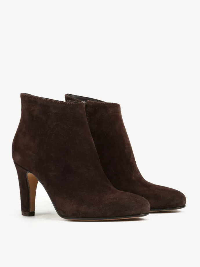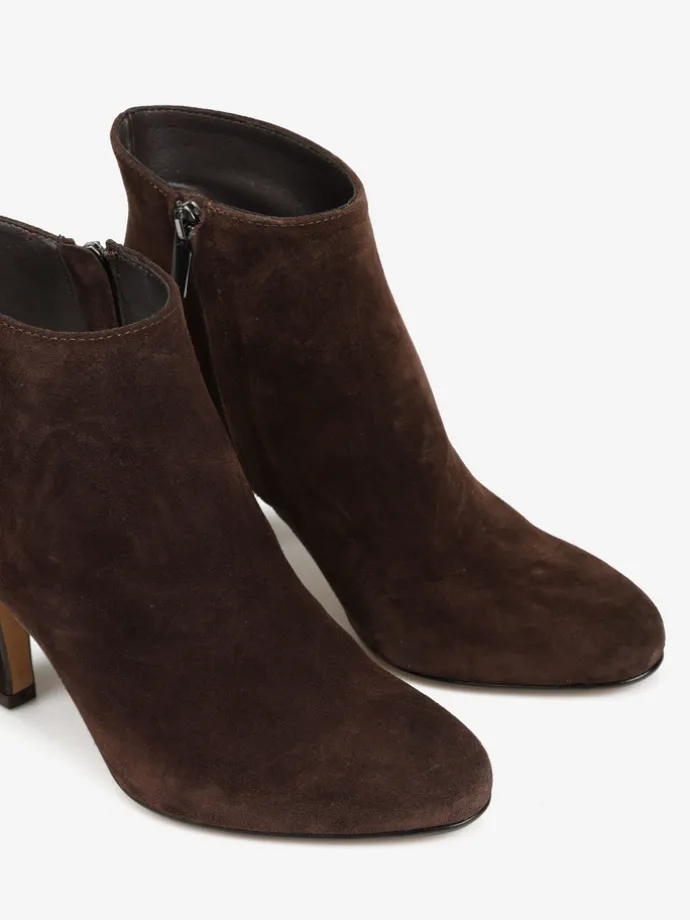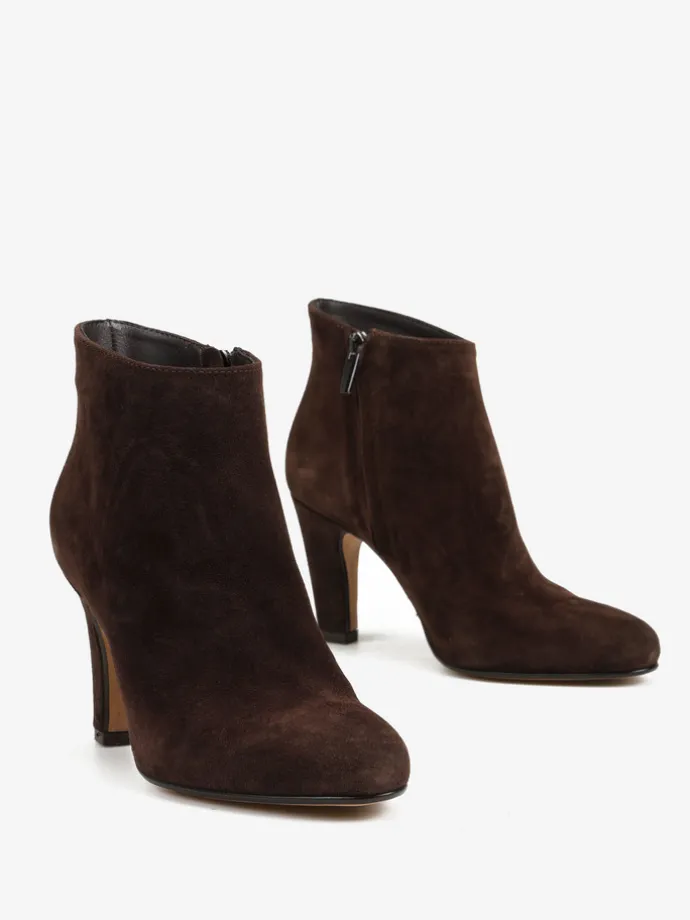 Zamszowe botki na wysokim obcasie. Okrągłe noski i zapięcie na suwak przy kostce.