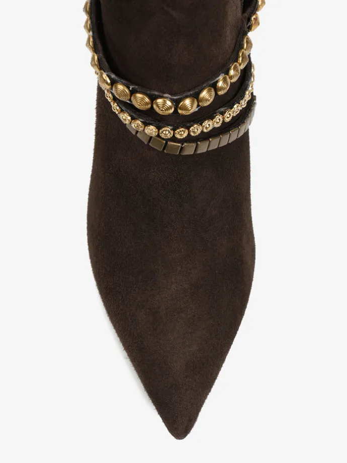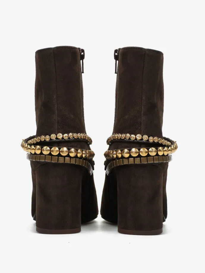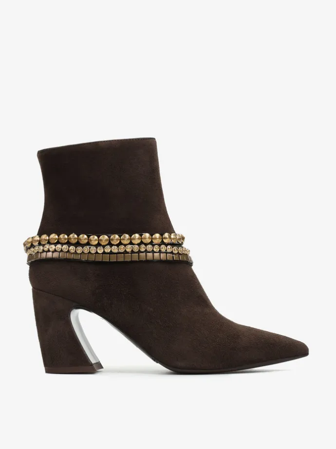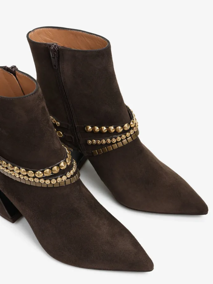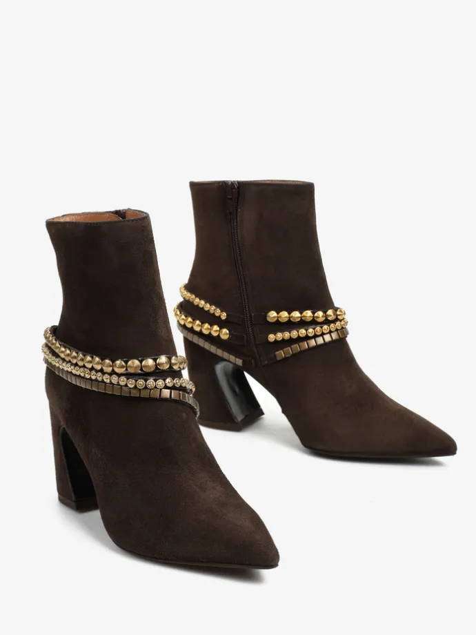 Zamszowe botki na słupku z noskami w szpic. Zapięcie na suwak i ozdobne bransoletki na kostce.