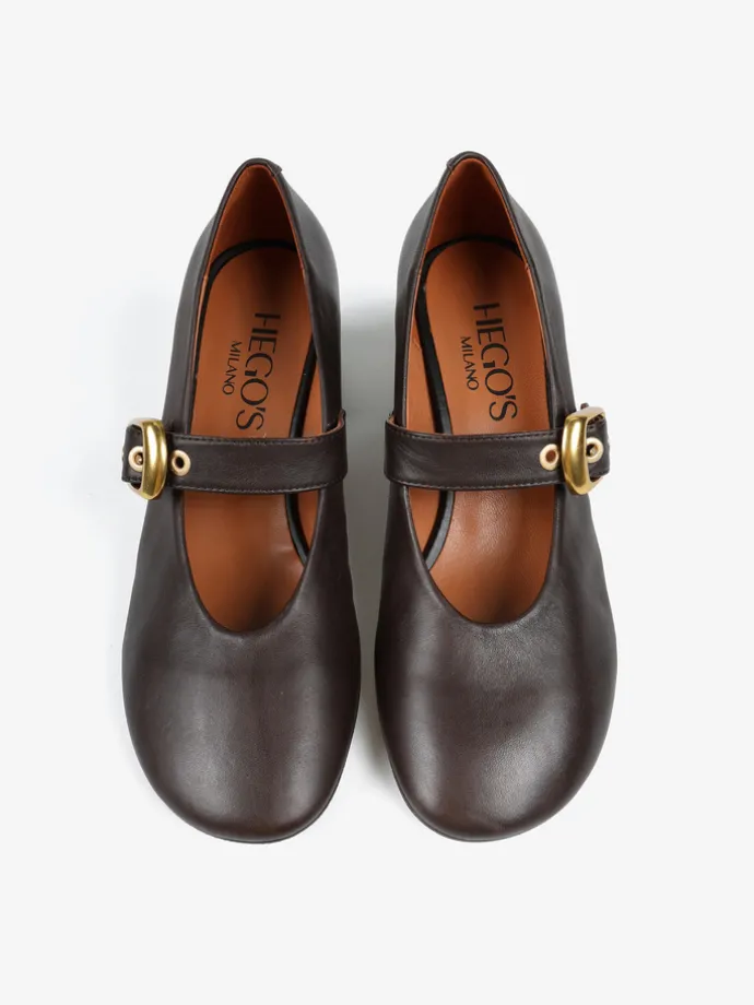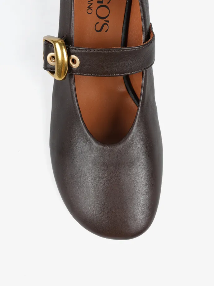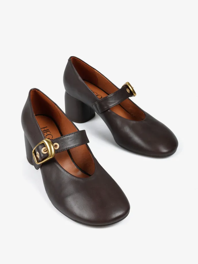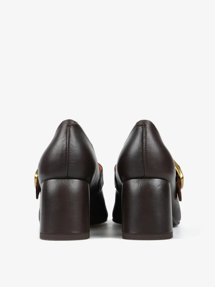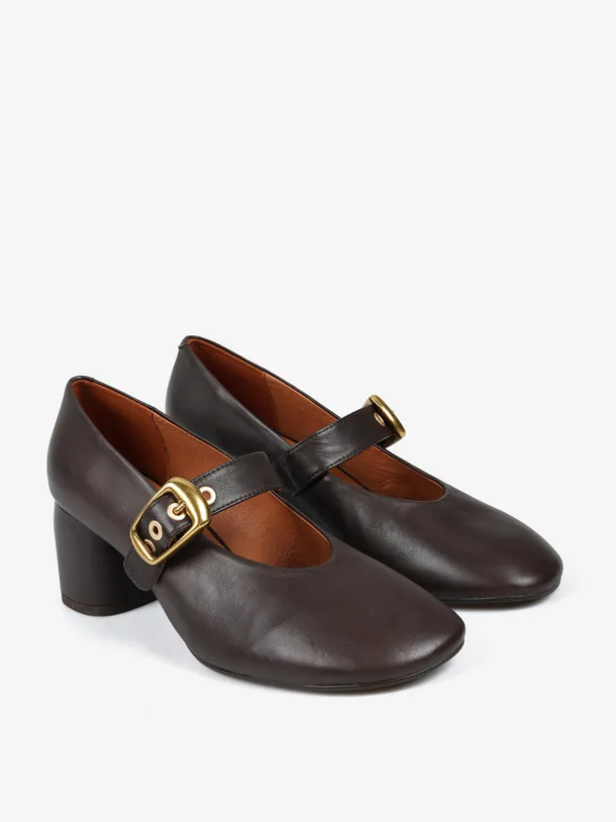 Czółenka Mary Jane na słupku. Owalne wycięcie i regulowany pasek.