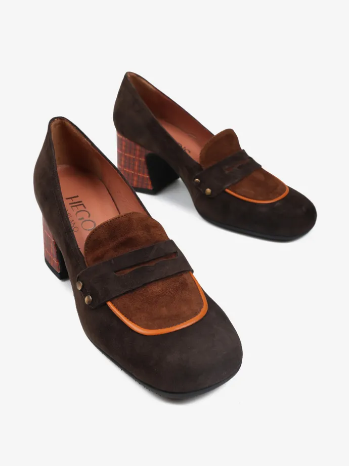 Zamszowe czółenka na słupku ze wzorem w kratkę. Kwadratowe noski, ozdobna patka z ćwiekami i kontrastująca, pomarańczowa lamówka.