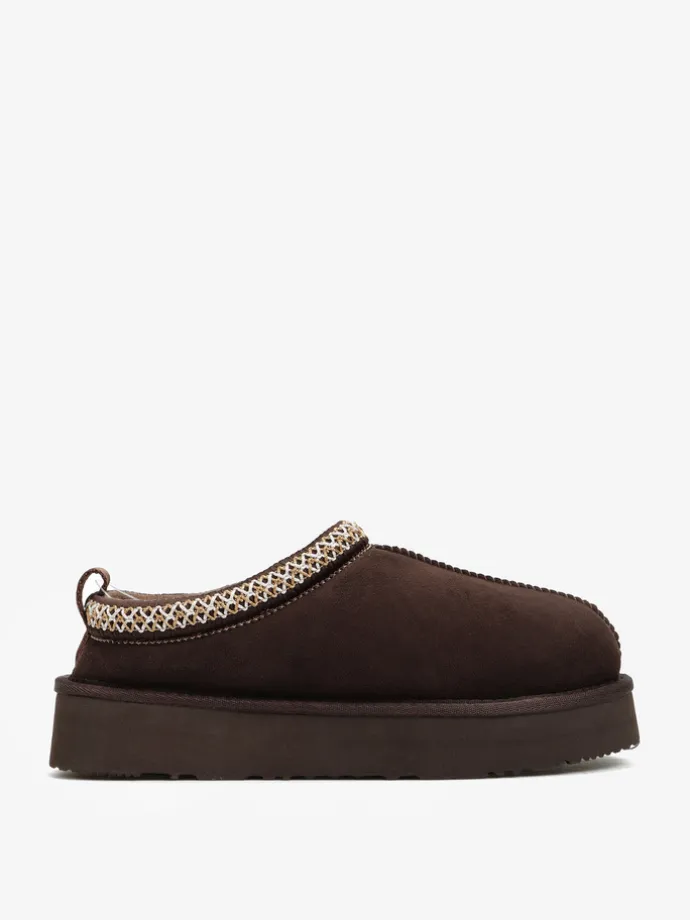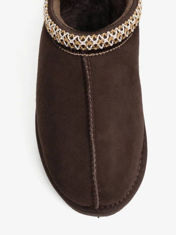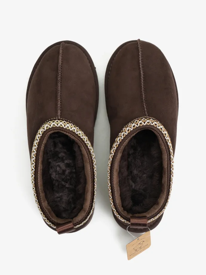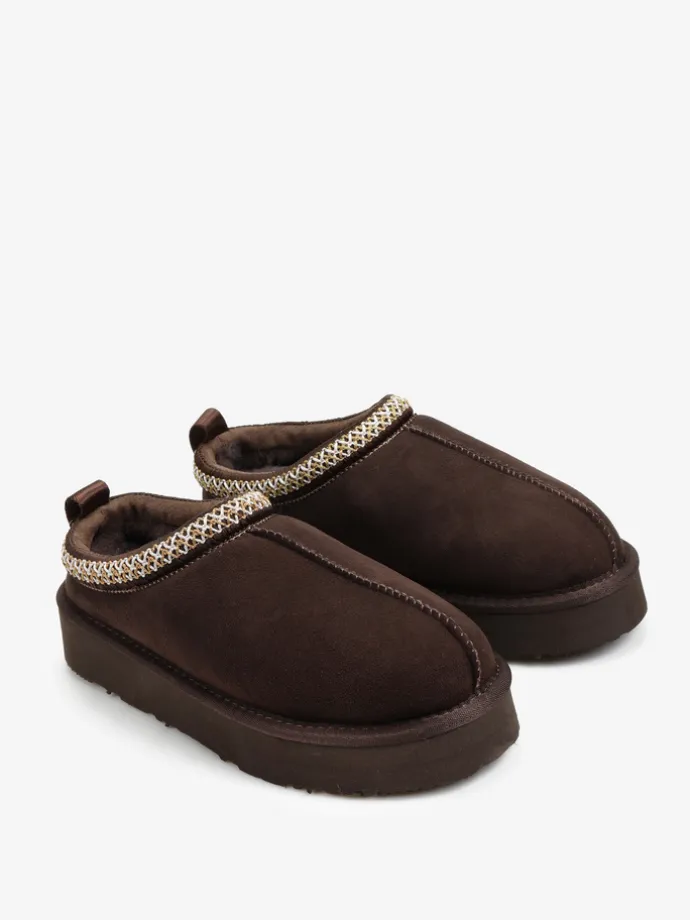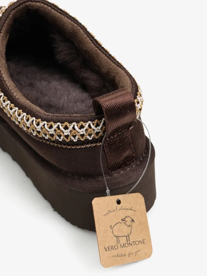 Wsuwane śniegowce typu slipper na platformie, wykonane z 100% naturalnej skóry owczej. Zewnętrzna warstwa to miękka, zamszowa skóra, natomiast wnętrze to ciepły, naturalny kożuch. Ozdobny haft na brzegu cholewki.