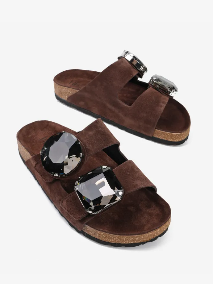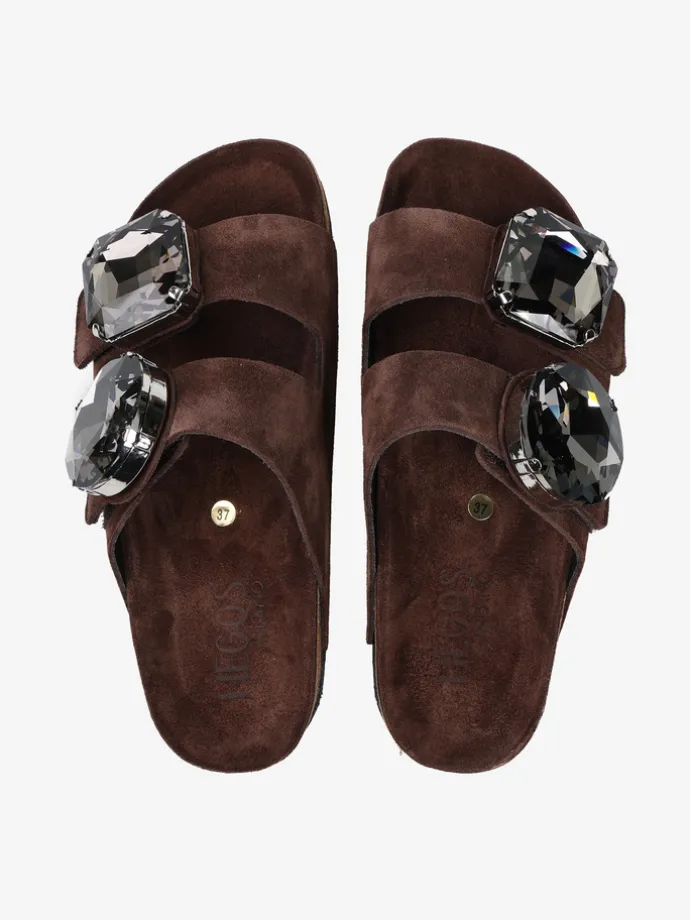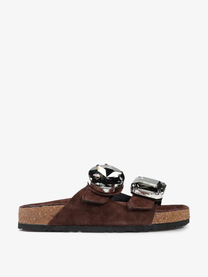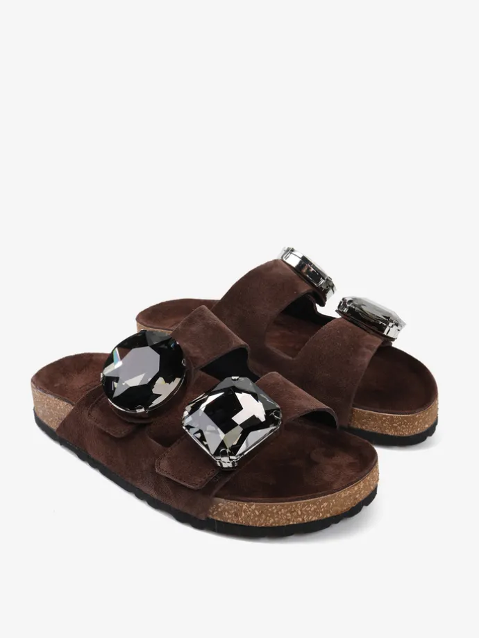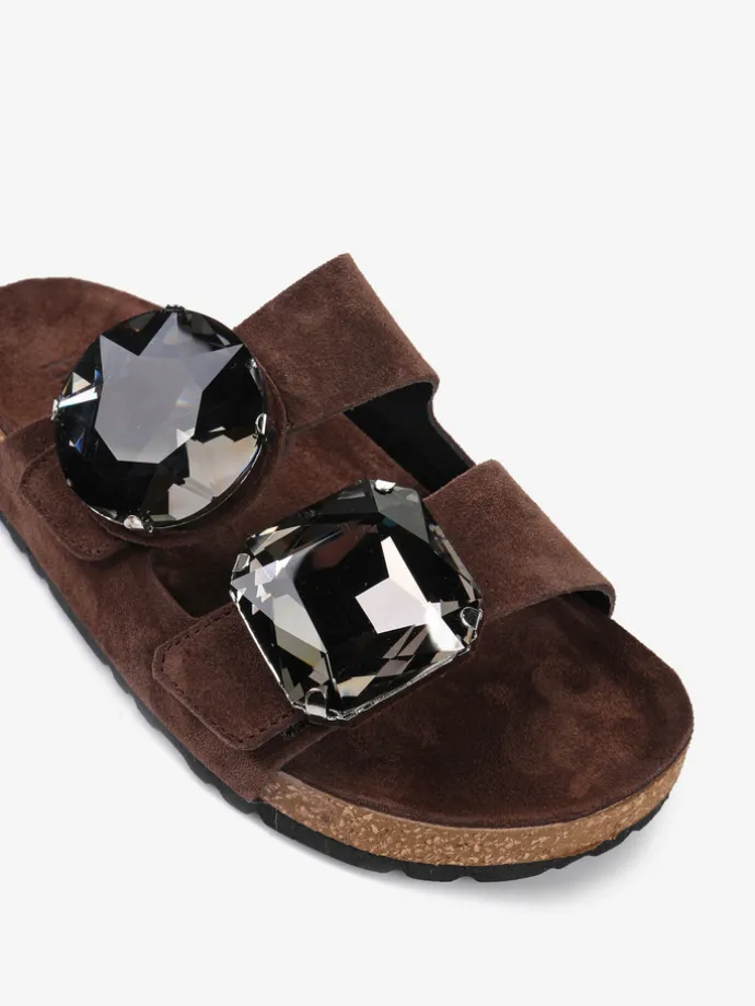Zamszowe klapki z ozdobnymi kamieniami i paskami zapinanymi na rzep.