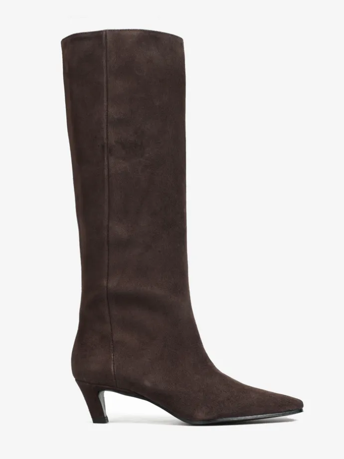 Wsuwane kozaki na niskiej szpilce z wydłużonymi, kwadratowymi noskami.