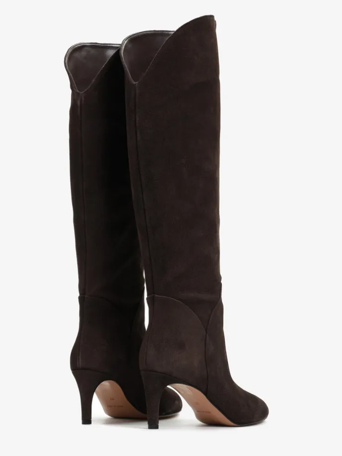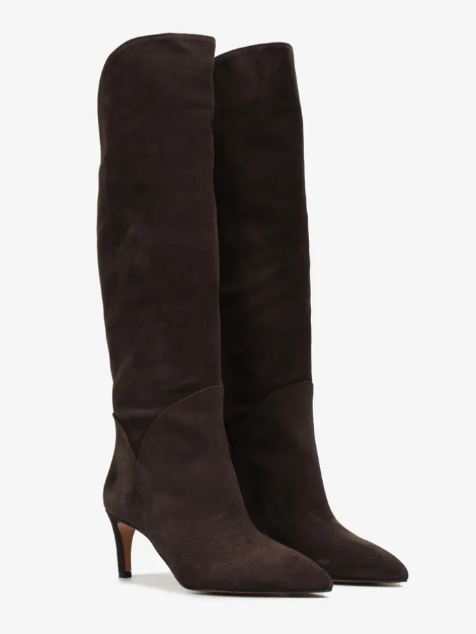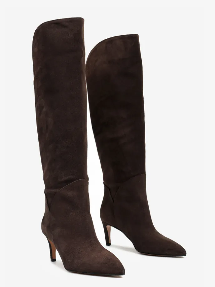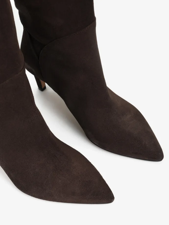 Zamszowe, wsuwane kozaki na szpilce w stylu muszkieterek. Noski w szpic i asymetryczna cholewka z ozdobnymi przeszyciami.