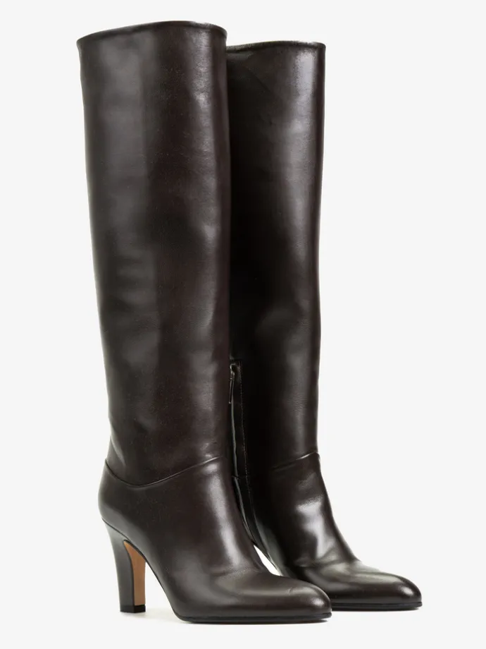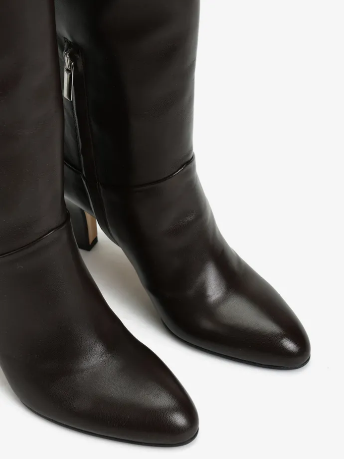 Czarne kozaki na słupku wykonane z miękkiej i delikatnej skóry. Zapięcie na suwak w dolnej części cholewki.