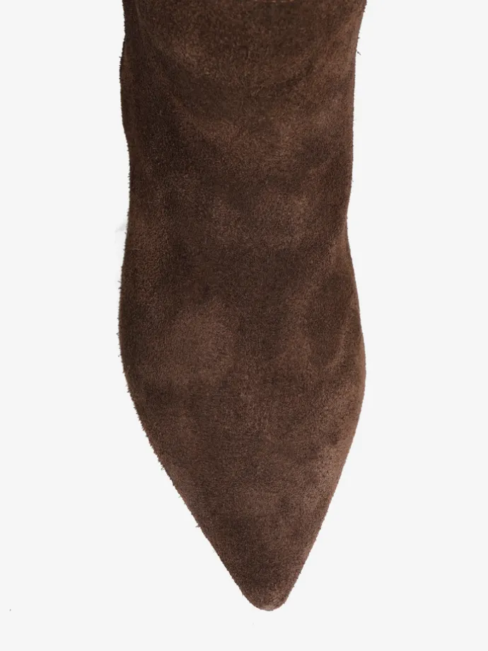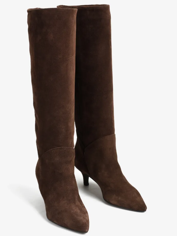 Zamszowe kozaki na niskiej szpilce. Noski w szpic i cholewka z ozdobnymi przeszyciami.