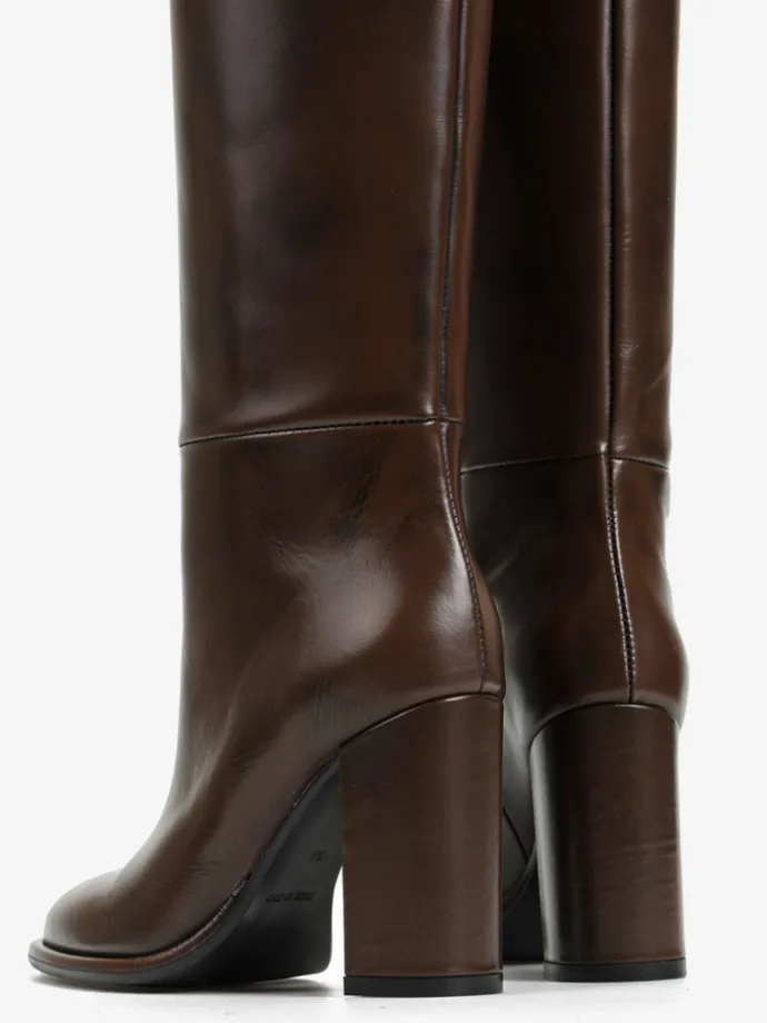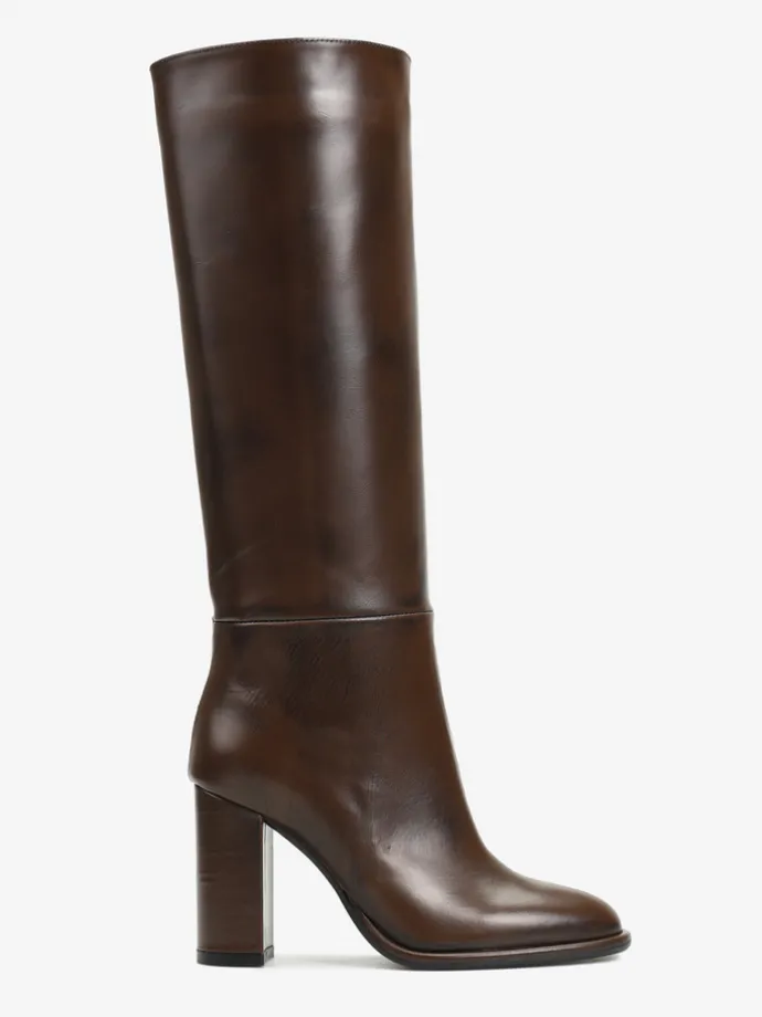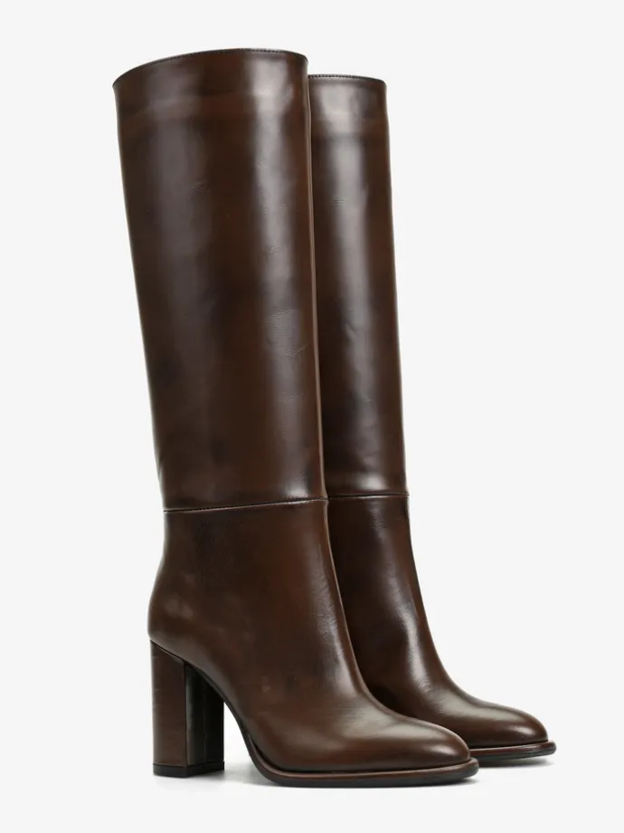 Proste, wsuwane kozaki na słupku z okrągłymi noskami.