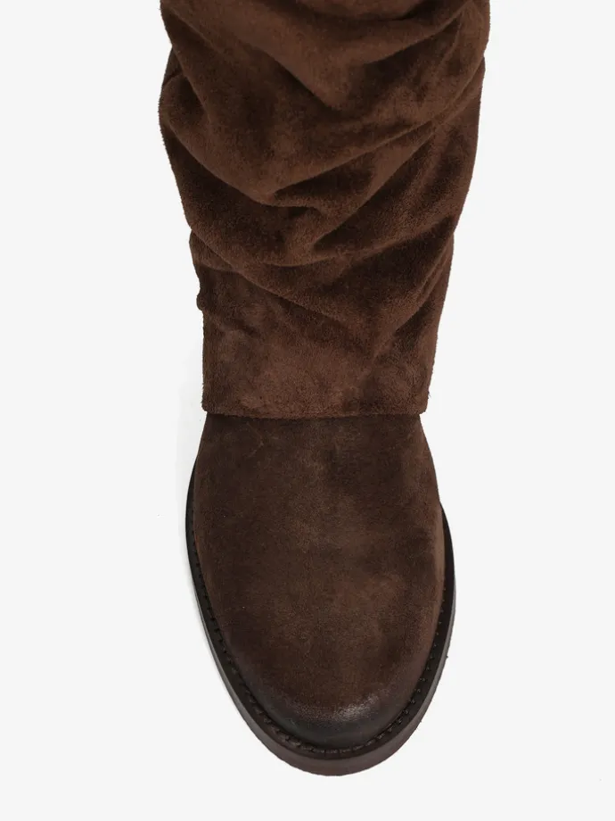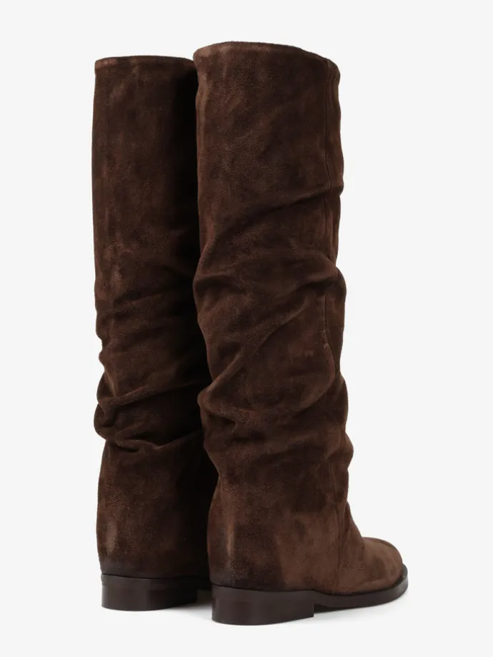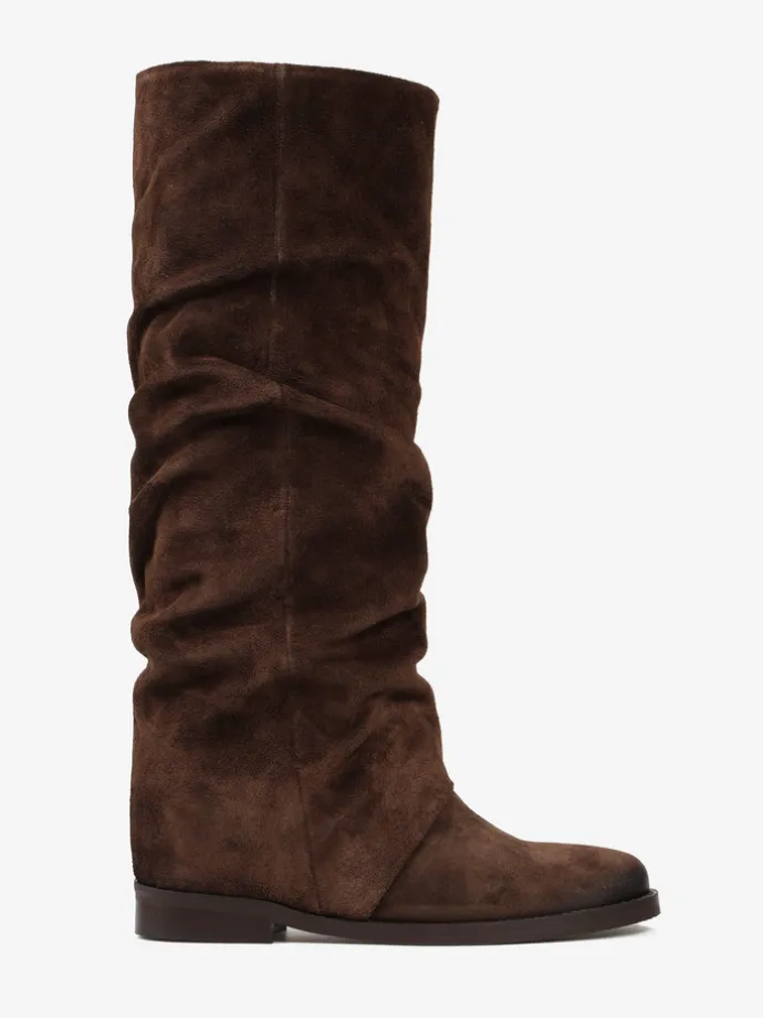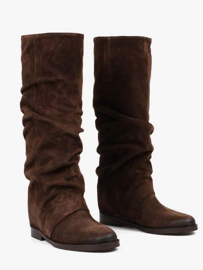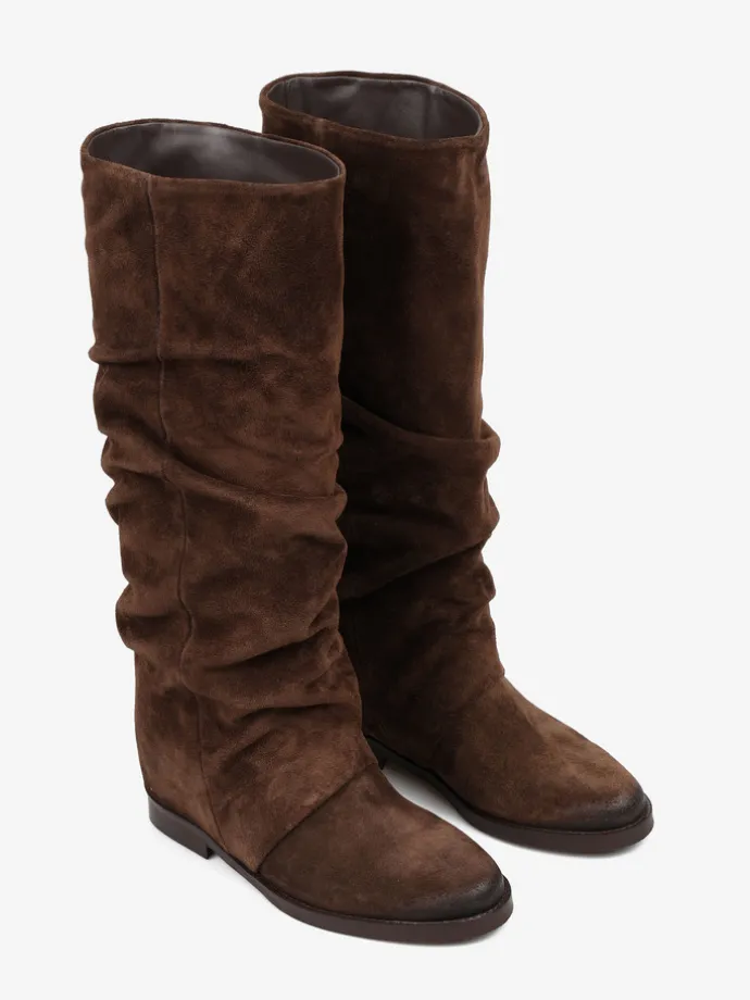 Wsuwane kozaki z ukrytym koturnem (ok. 5 cm) i przedłużoną, marszczoną cholewką.
