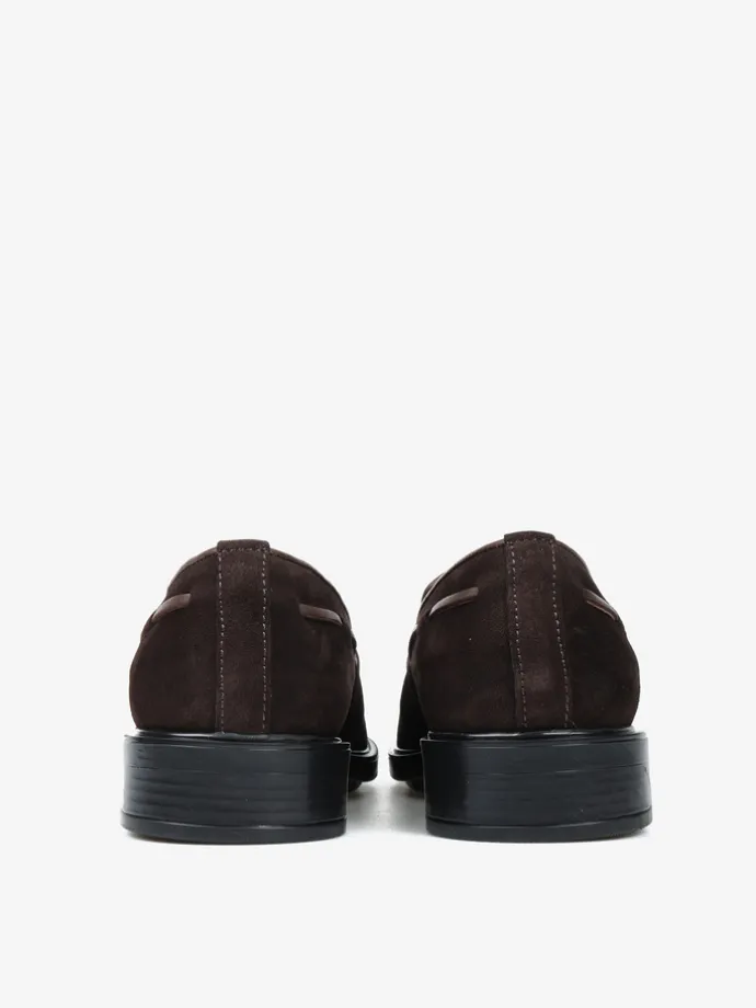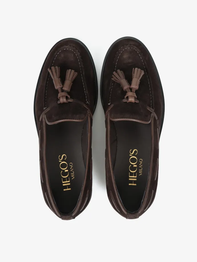Zamszowe mokasyny z ozdobnym rzemykiem i frędzlami. Przywieszka dostępna oddzielnie.