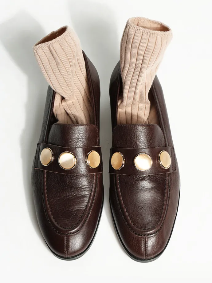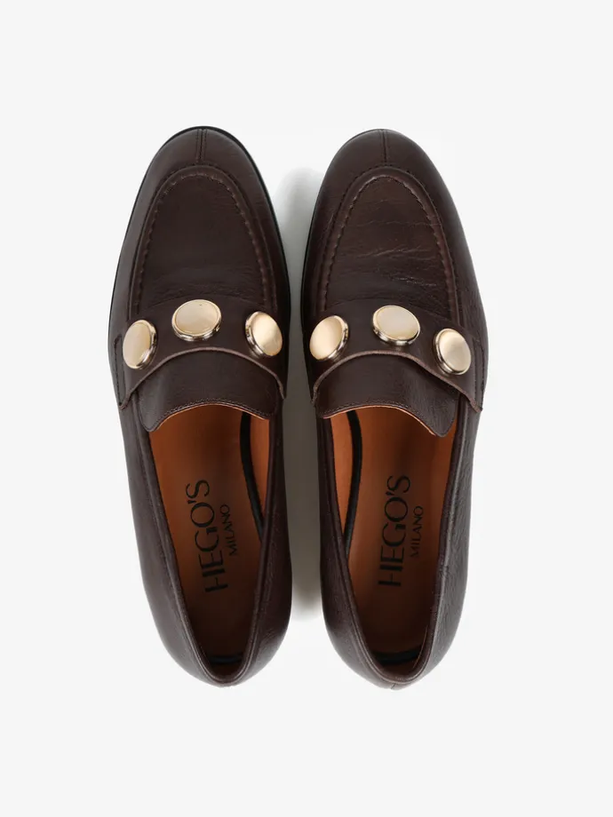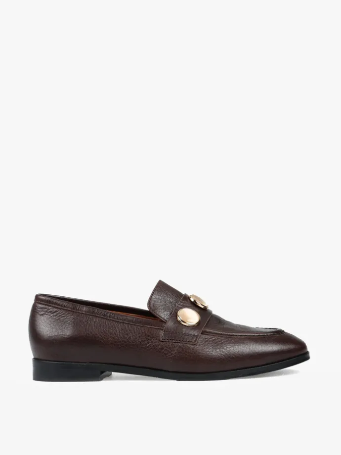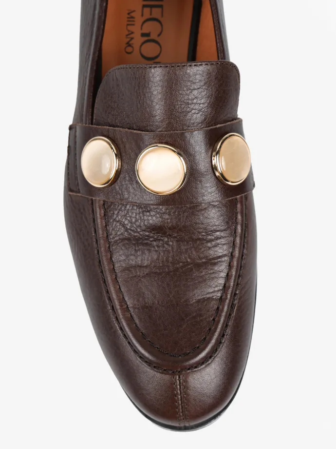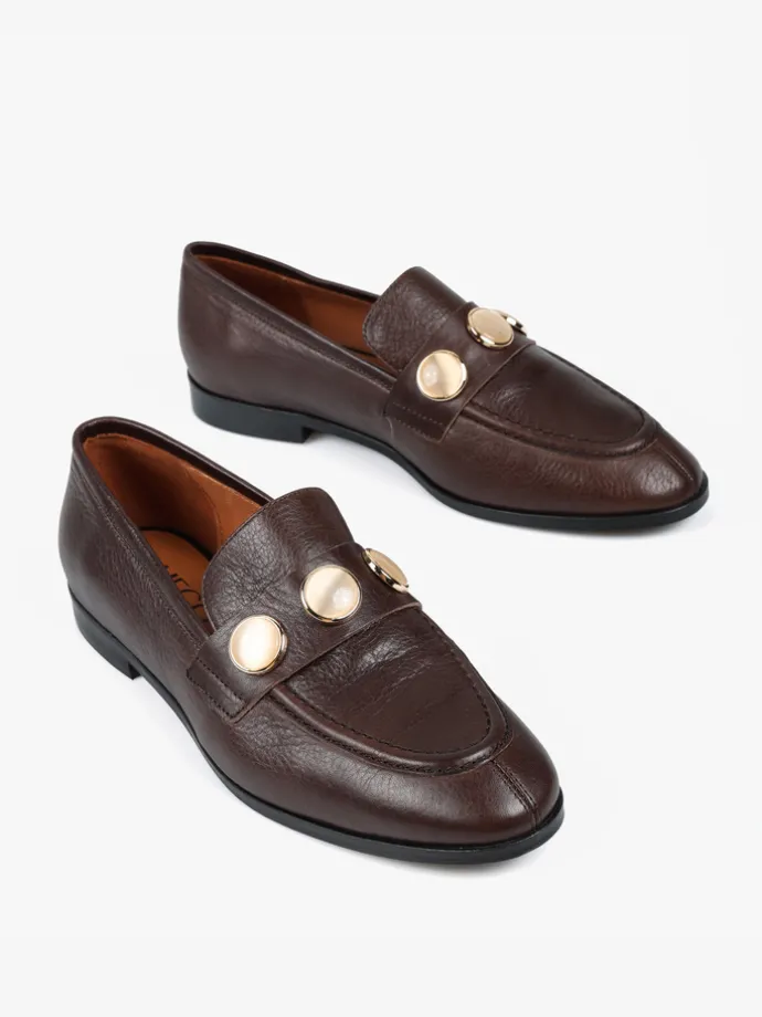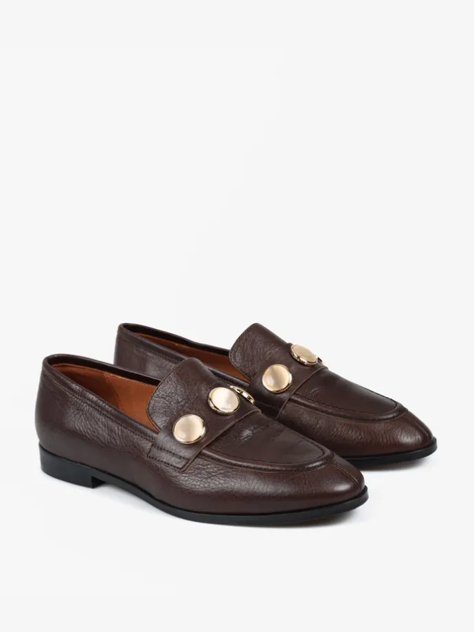 Klasyczne mokasyny wykonane z czekoladowobrązowej skóry. Ozdobna patka z biżuteryjną aplikacją.