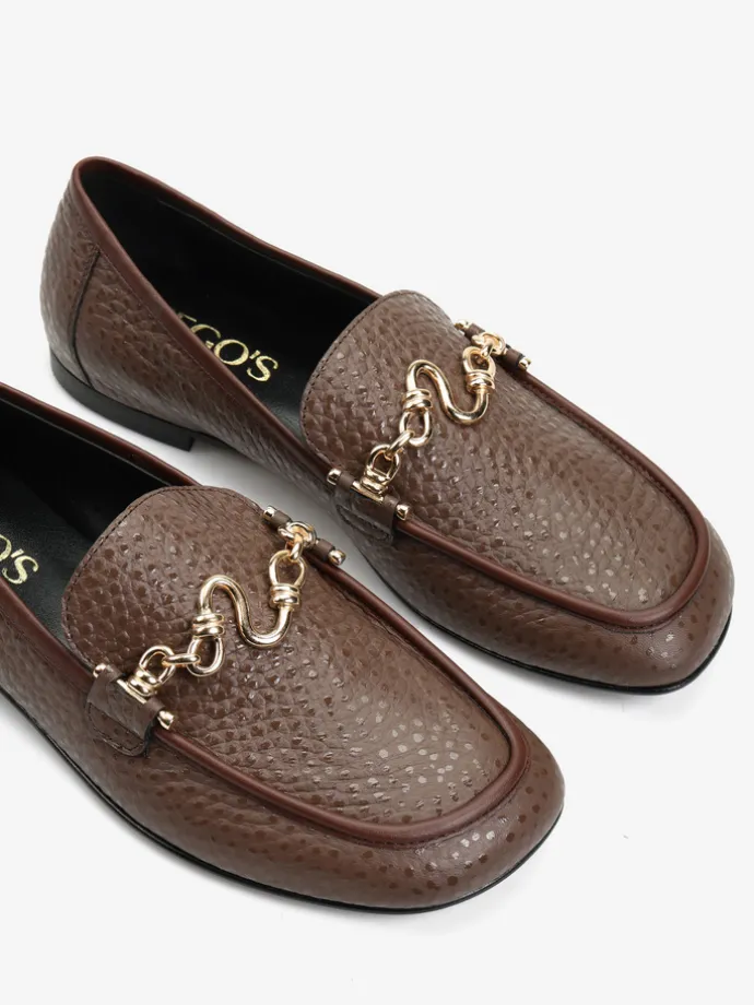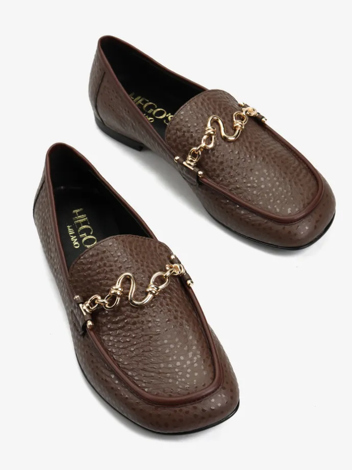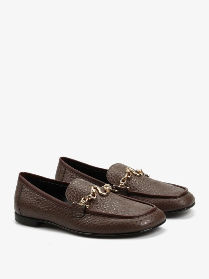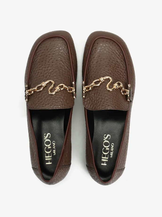 Mokasyny z asymetrycznym noskiem i biżuteryjną aplikacją, wykonane z mięsistej skóry.