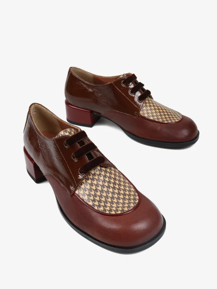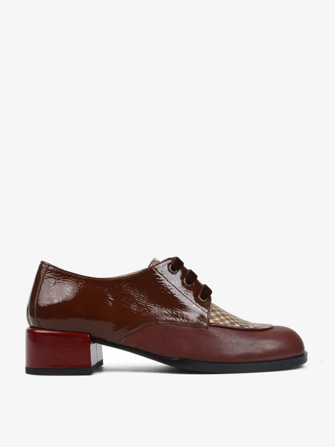 Półbuty na niskim słupku w odcieniach brązu i bordo. Kwadratowe noski, wzorzysty język i welurowe sznurowadła.