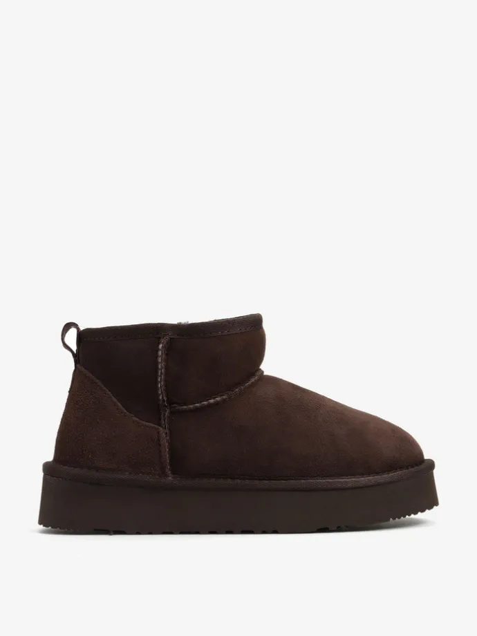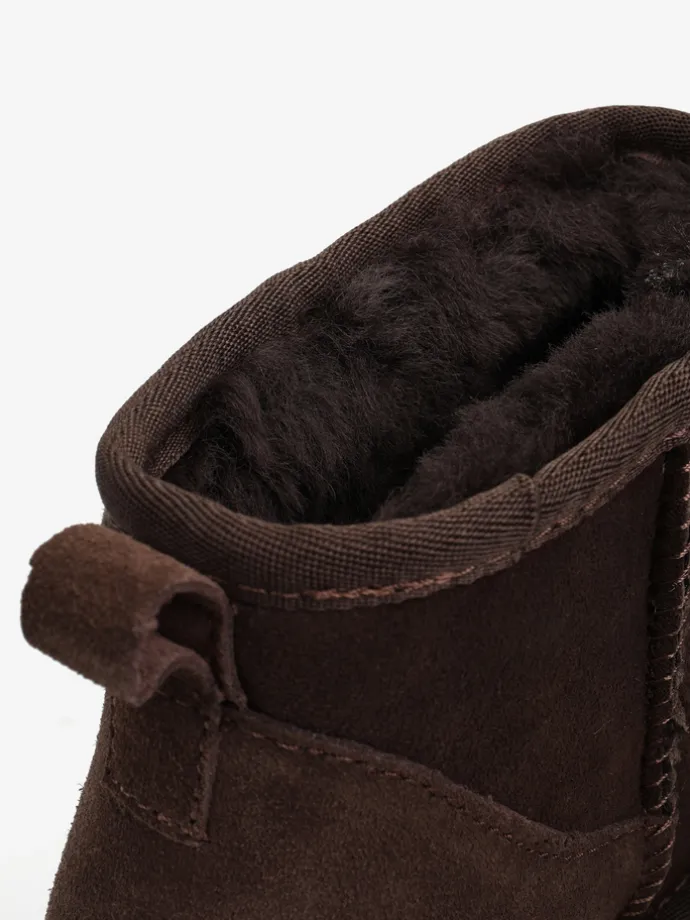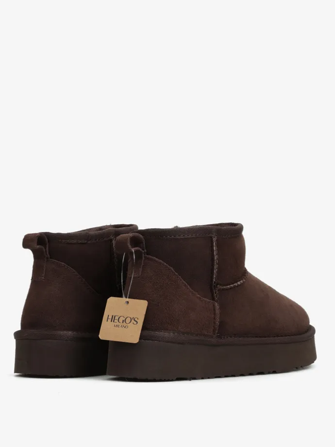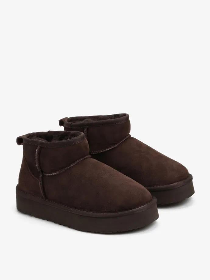 Krótkie śniegowce na średniej platformie, wykonane z 100% naturalnej skóry owczej. Zewnętrzna warstwa to miękka, zamszowa skóra, natomiast wnętrze to ciepły, naturalny kożuch.
