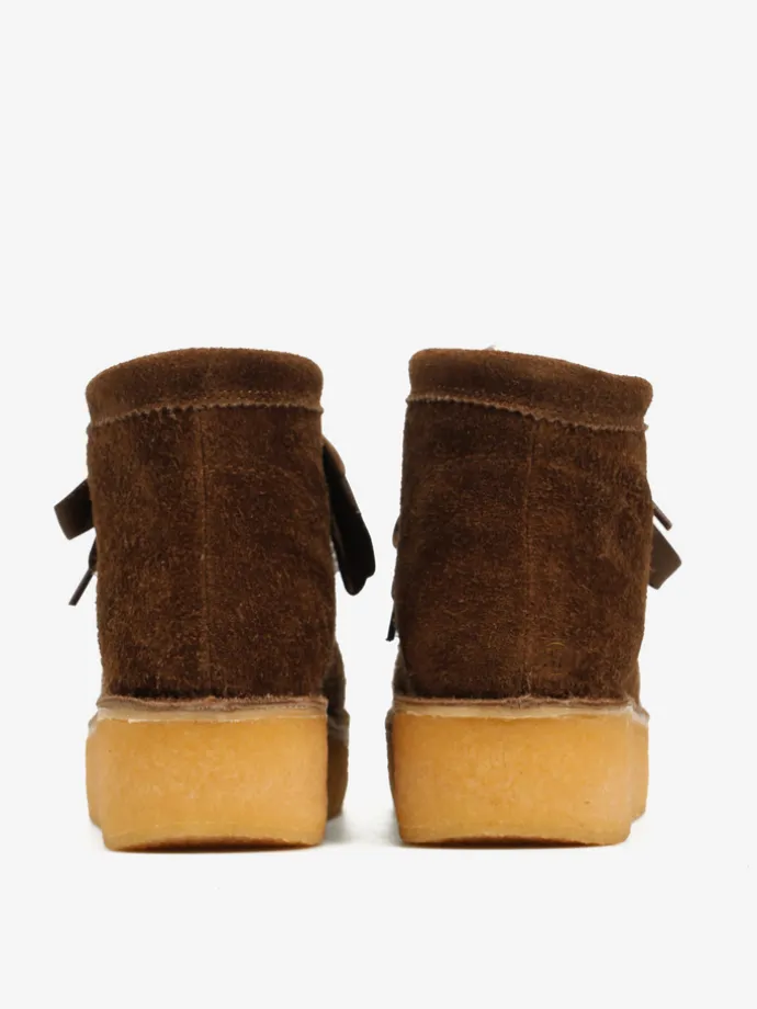 Zamszowe śniegowce na platofmie, wyłożone w środku tkaniną imitującą futro baranka. Wiązanie na sznurowadła.