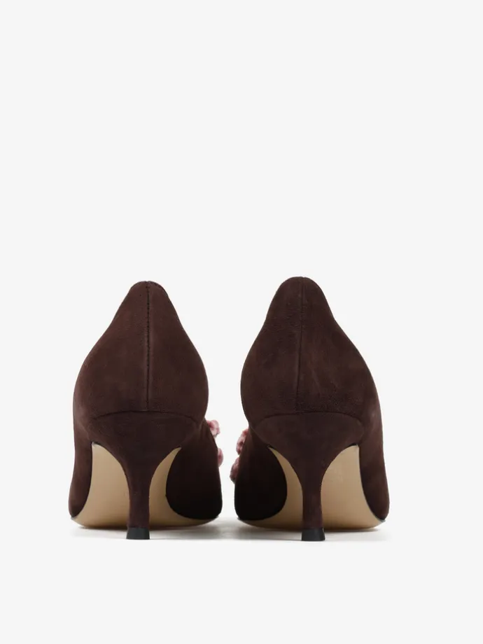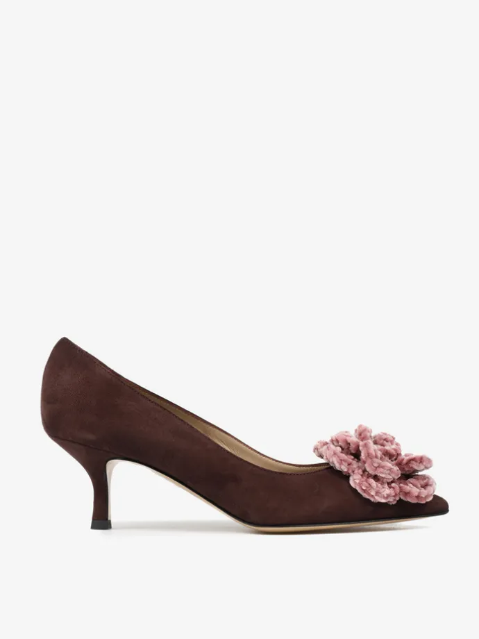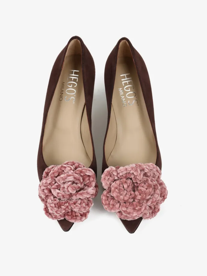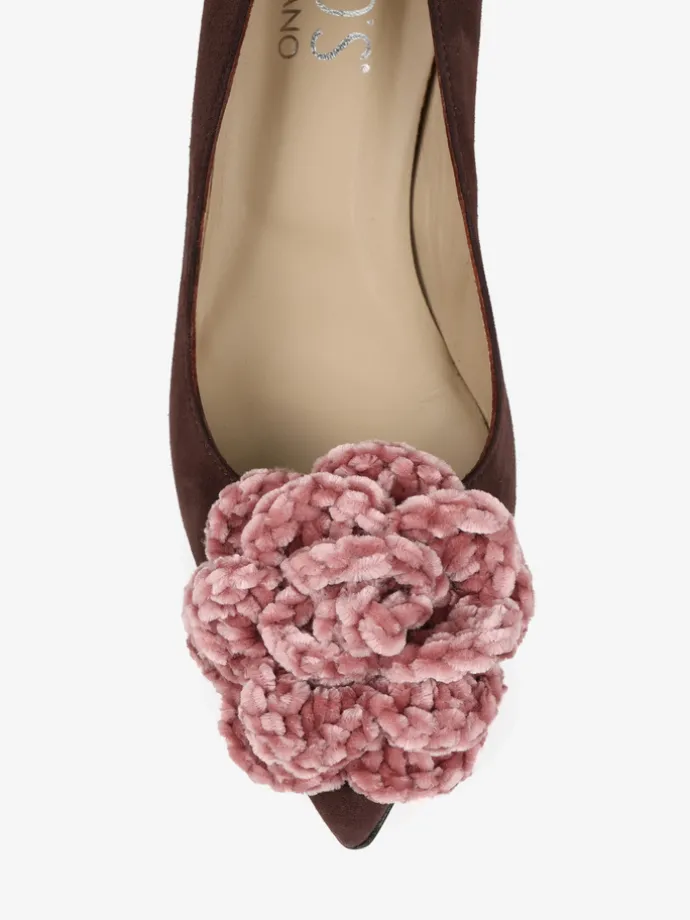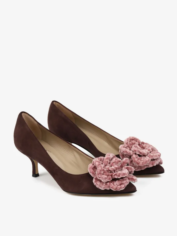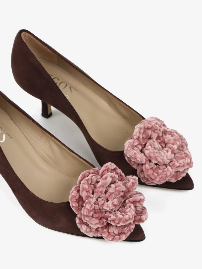 Zamszowe szpilki z noskiem w szpic ozdobione szydełkowym, pudrowo różowym kwiatem.