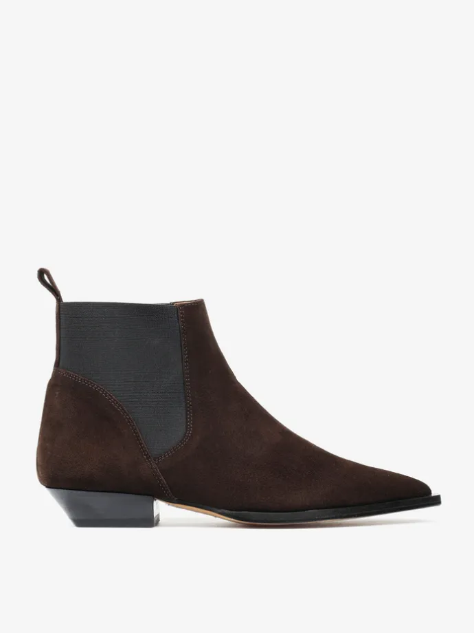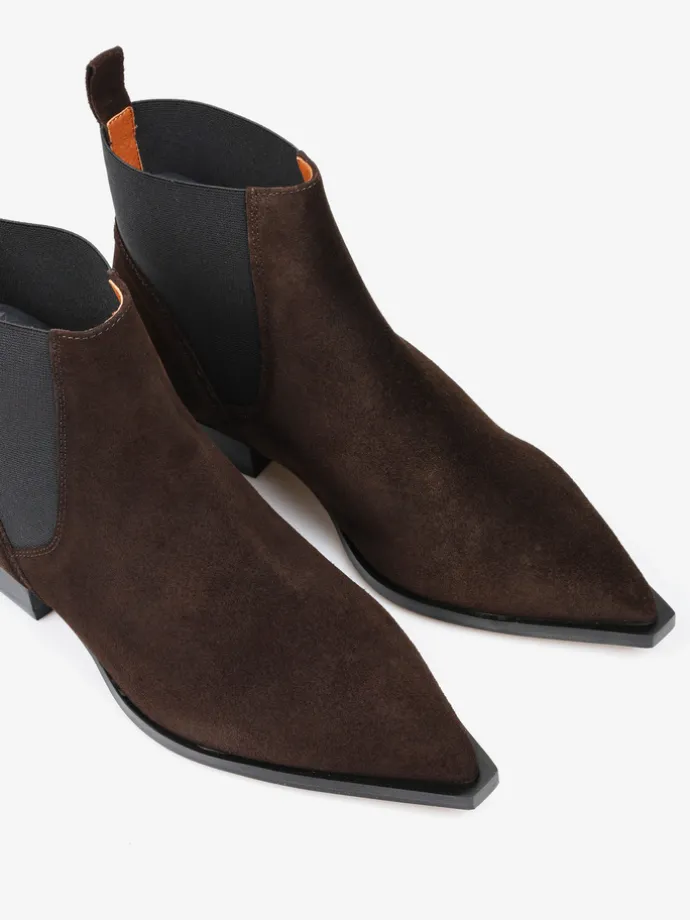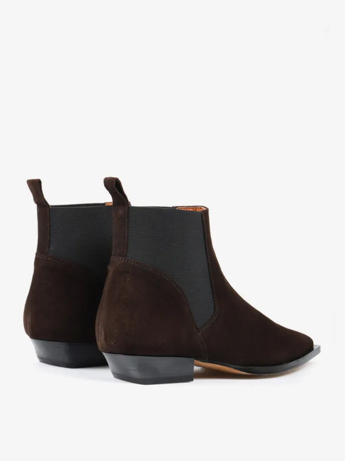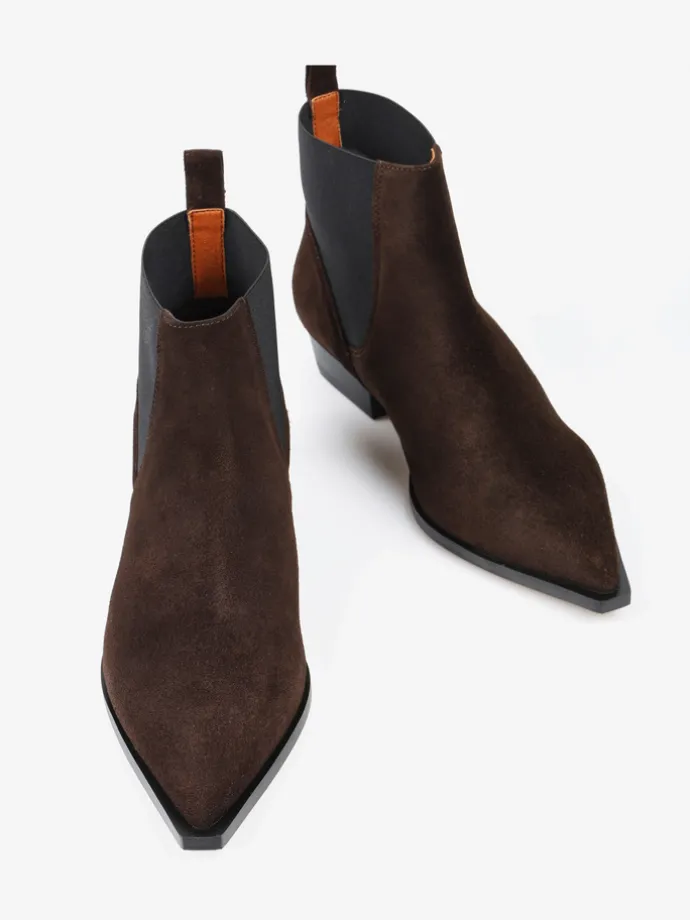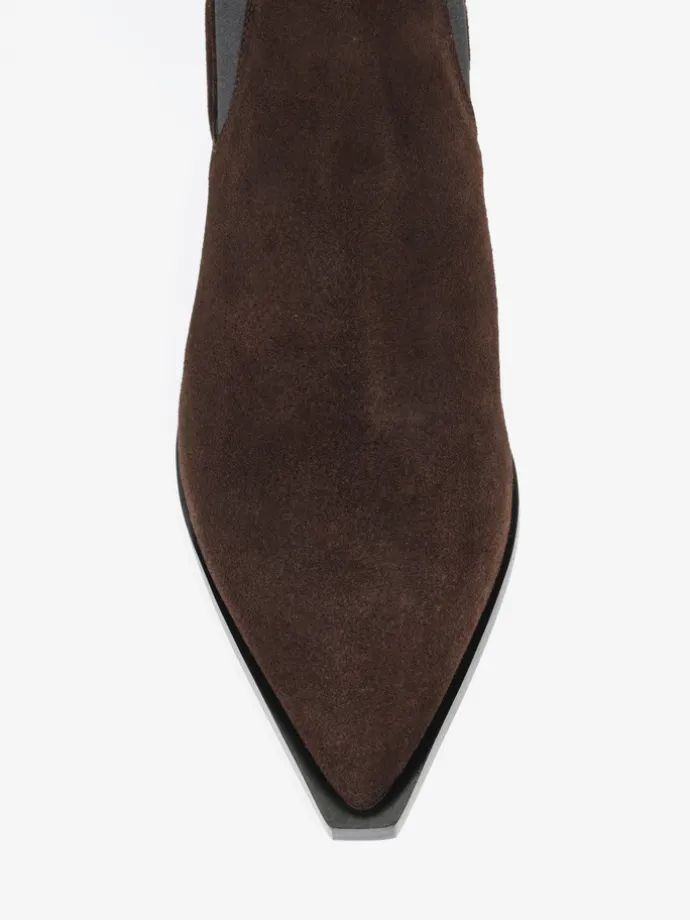 Zamszowe sztyblety w stylu kowbojskim. Noski w szpic i niski obcas.