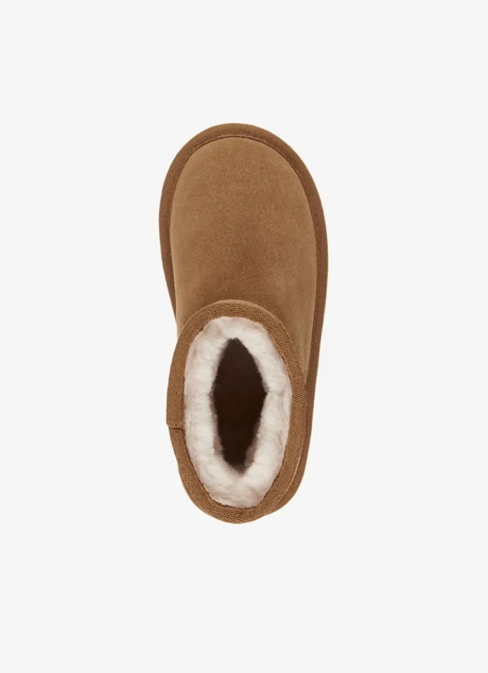 EMU Australia Wallaby Mini Teens to model wykonany najwyżej jakości skóry zamszowej. Wnętrze jest podszyte wełną z australijskich owiec merynosów o oddychających właściwościach. Warto zaimpregnować buty przed pierwszym spacerem preparatem do naturalnego zamszu i nubuku, dzięki temu będą odporne na zachlapania i wilgoć.Materiały użyte w modelu Wallaby Mini utrzymują stopy w cieple nawet przy temperaturze -30°C oraz chłodzą je w te cieplejsze. Ważną zaletą wełny jest to, że nie przegrzewa stóp, dając poczucie komfortu w każdej temperaturze. Skóra na pięcie jest specjalnie wyprofilowana dla lepszego wsparcia, dopasowania i utrwalenia fasonu.