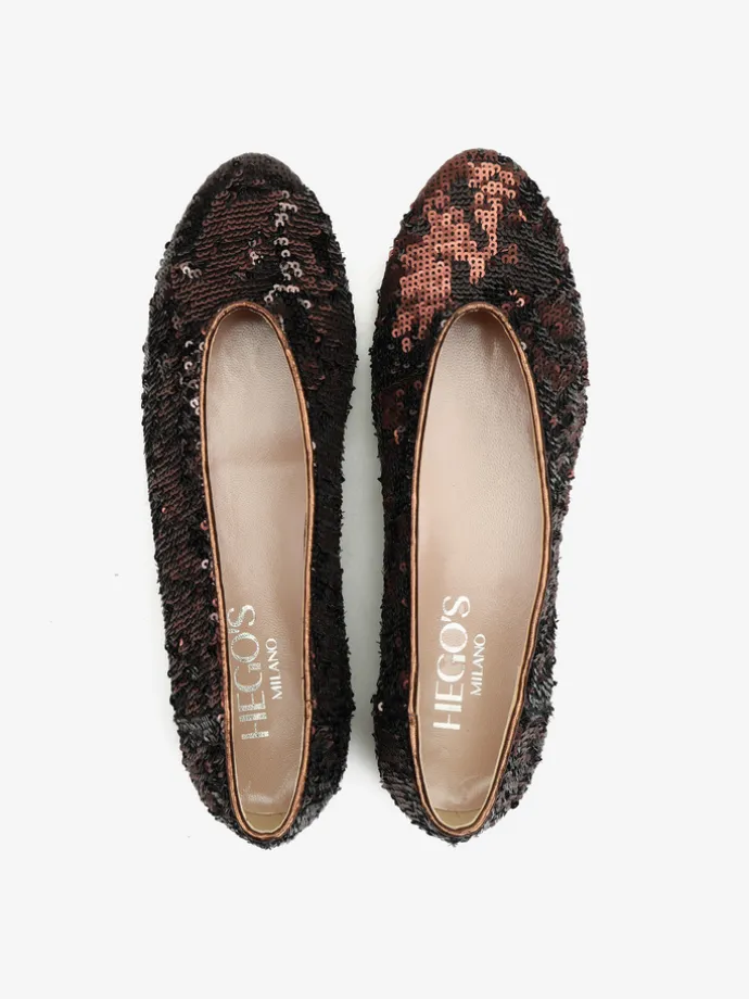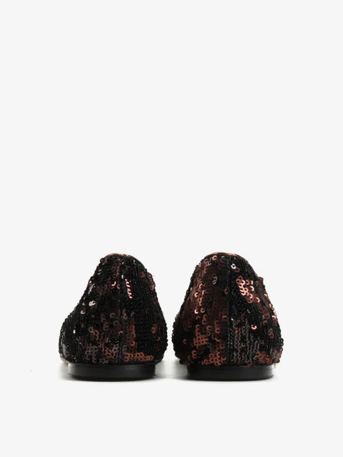 Proste baleriny z owalnym wycięciem i zabudowanymi brzegami na skórzanej podeszwie. Wykończone dwustronnymi cekinami, które można układać.