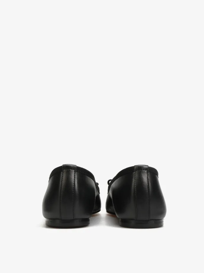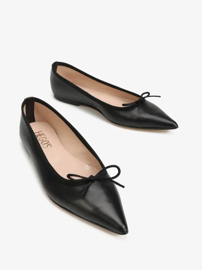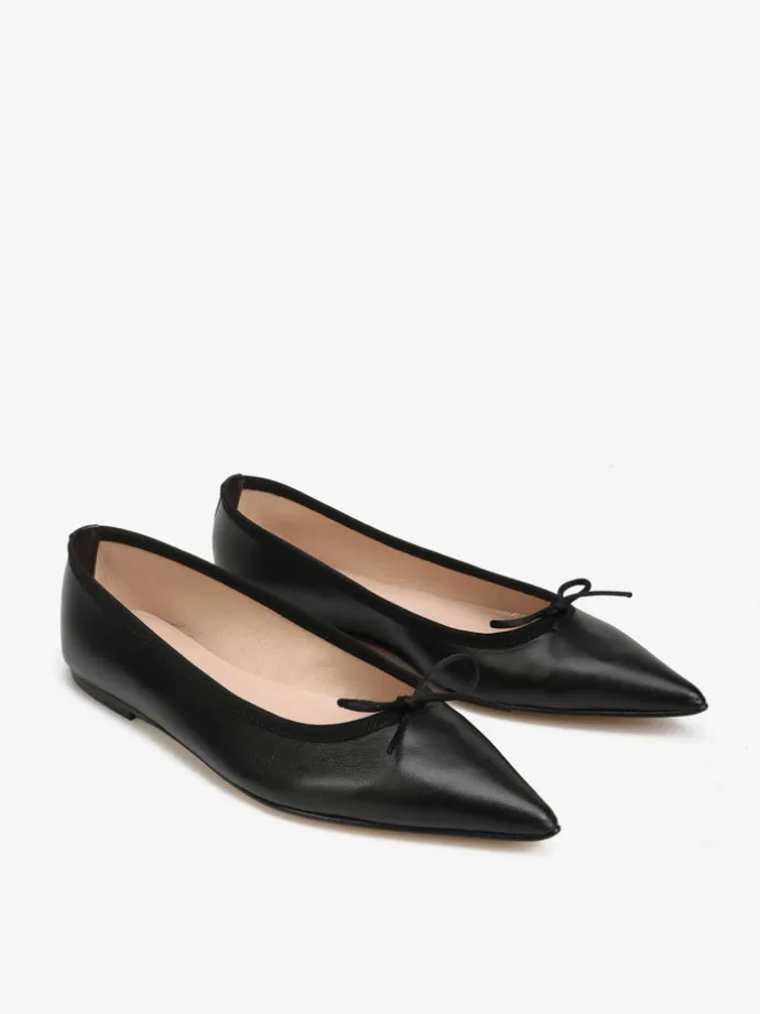 Baleriny z noskiem w szpic wykonane z wysokiej jakości skóry. Wiązana kokardka umożliwia regulację dopasowania.