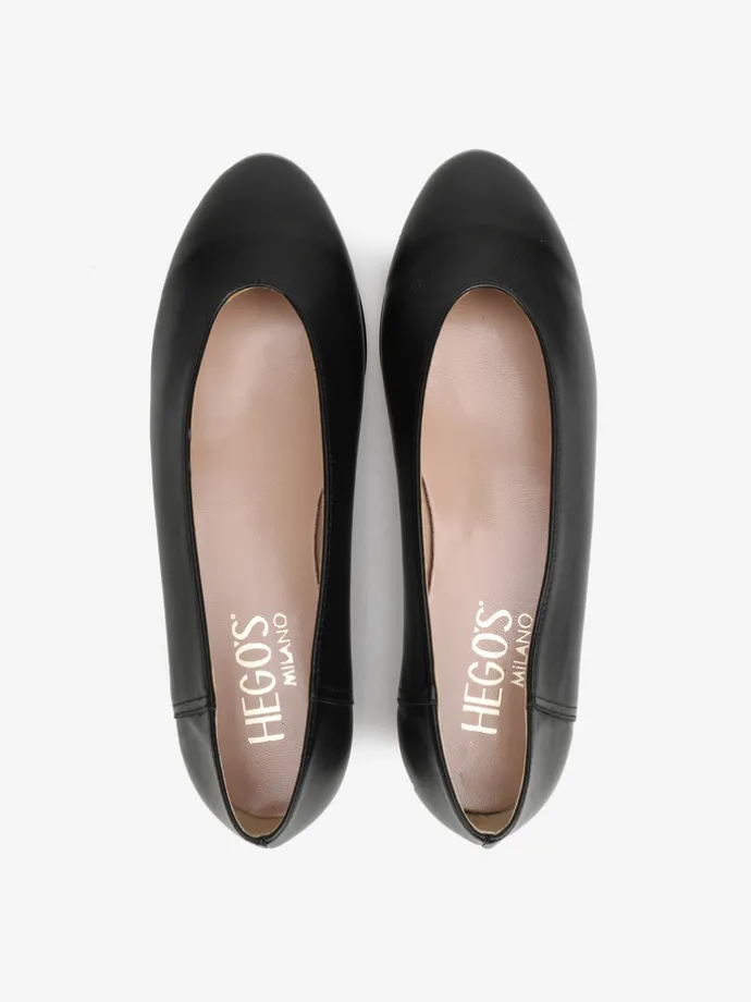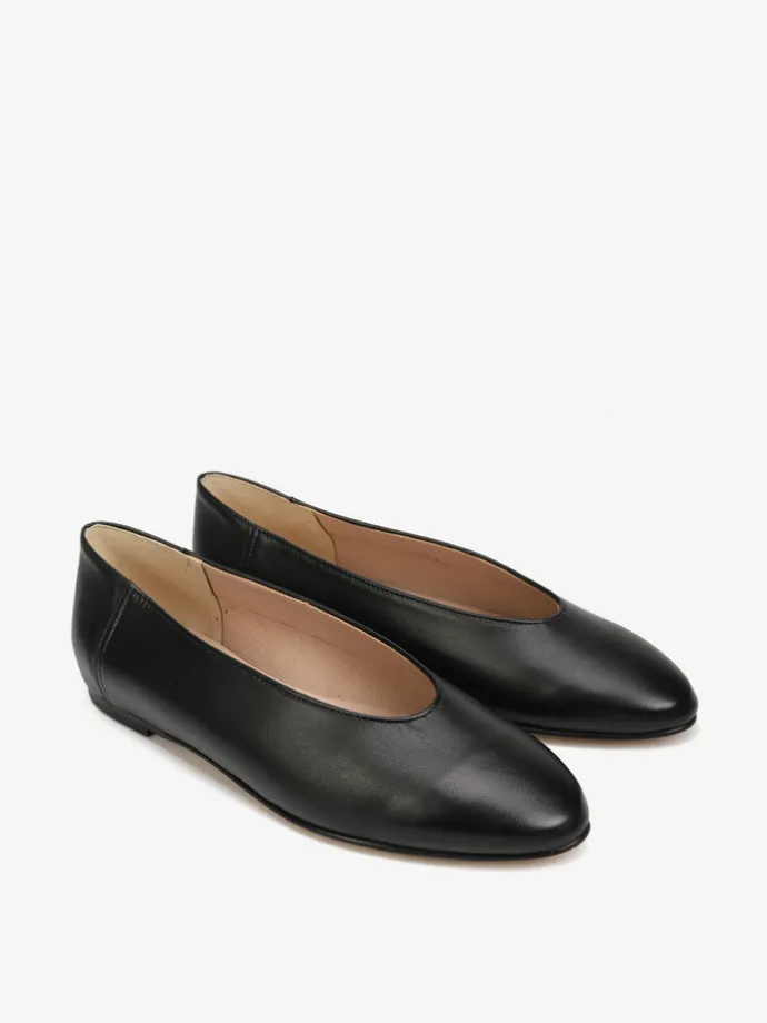 Proste baleriny z owalnym wycięciem i zabudowanymi brzegami na skórzanej podeszwie, wykonane z delikatnej, miękkiej skóry.
